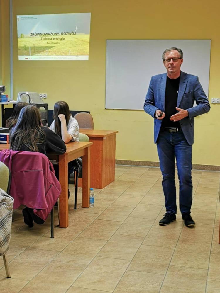 Podczas zajęć uczniowie mieli okazję dowiedzieć się, czym jest zielona energia i jak istotna jest jej rola w ochronie środowiska. Prorektor Chwastyk w przystępny sposób wyjaśnił, jak można wytwarzać odnawialne źródła energii i jakie korzyści niesie ich wykorzystanie w codziennym życiu.