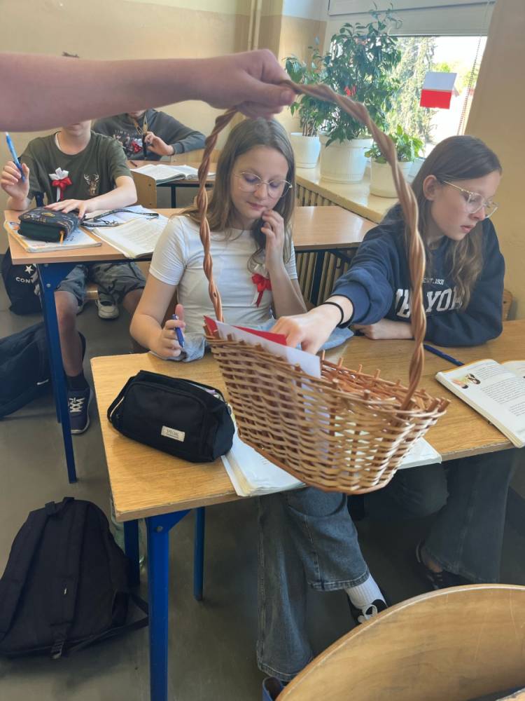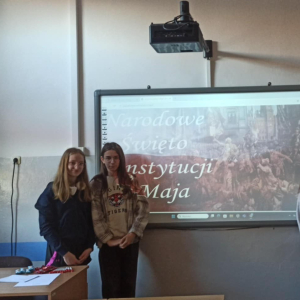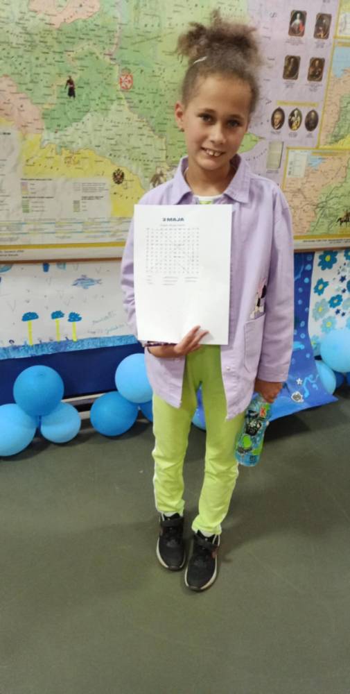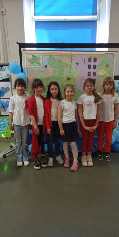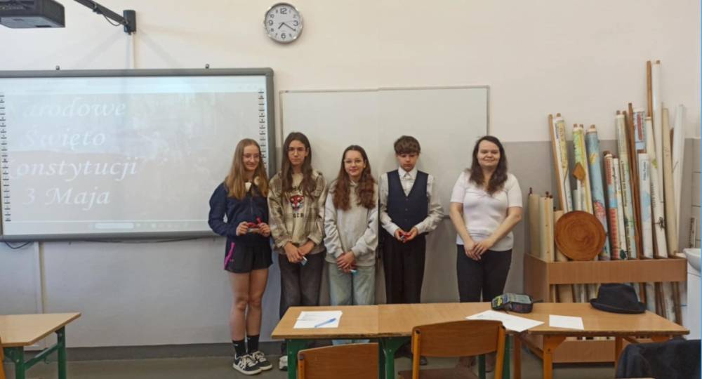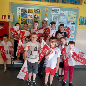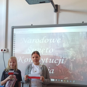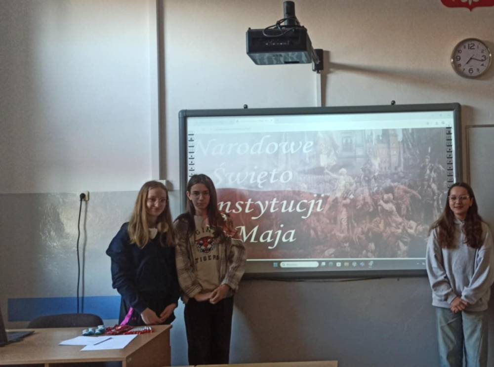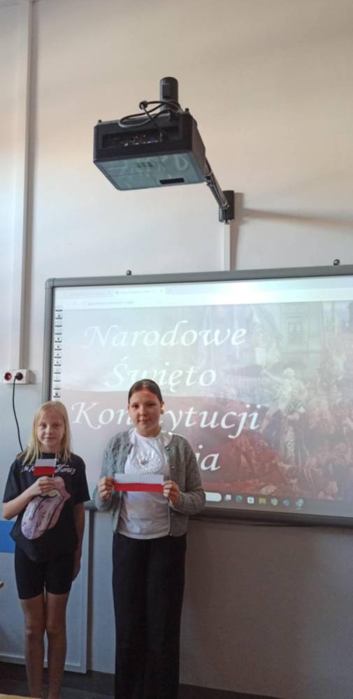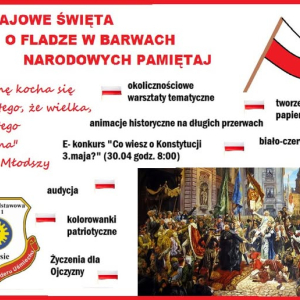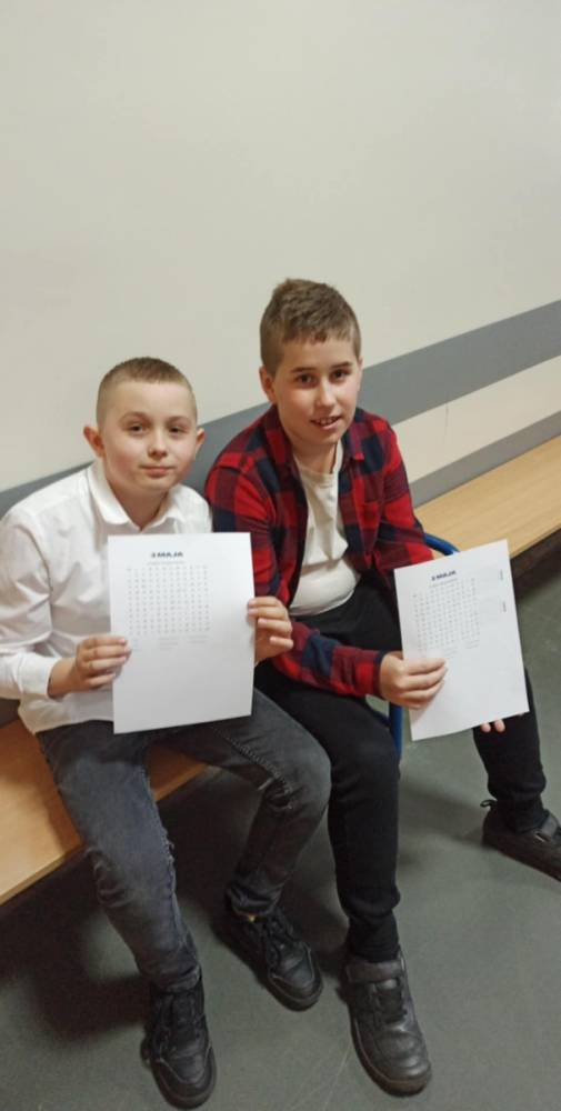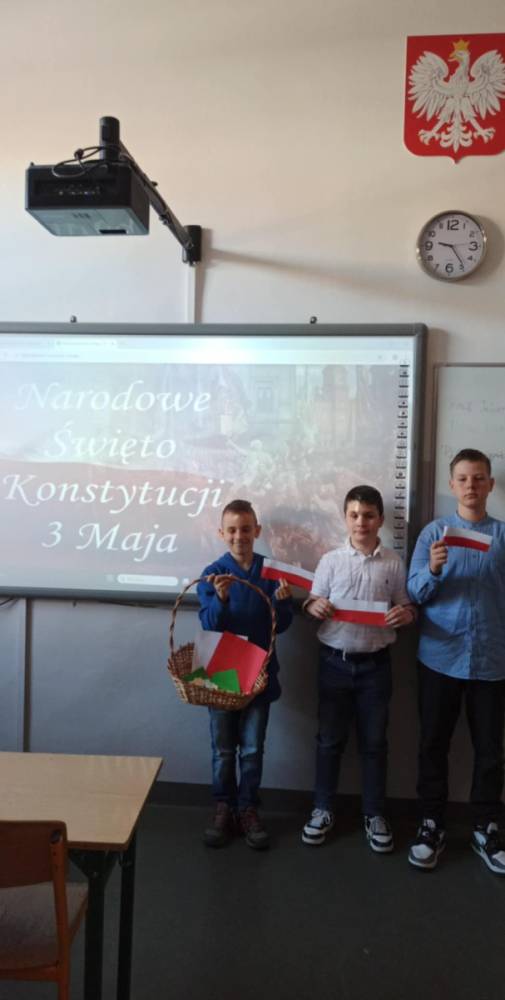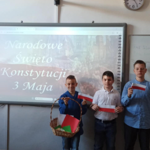 Uczniowie klas starszych wzięli udział w konkursie "Co wiesz o Konstytucji Trzeciego Maja? ". Za wykazanie się wiedzą zostali oni nagrodzeni drobnymi biało-czerwonymi i słodkimi upominkami. Dobrą zabawę całej społeczności szkolnej gwarantowały również "Patriotyczne przerwy", w trakcie których obejrzeć można było na holu I piętra wystawę dotyczącą genezy świąt majowych, specjalnie przygotowane animacje wyświetlane na "kinowym ekranie". Chętni zmierzyć się mogli z tematycznymi wykreślankami, a mali artyści - swój talent doskonalili poprzez kolorowanki.
