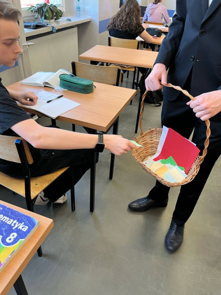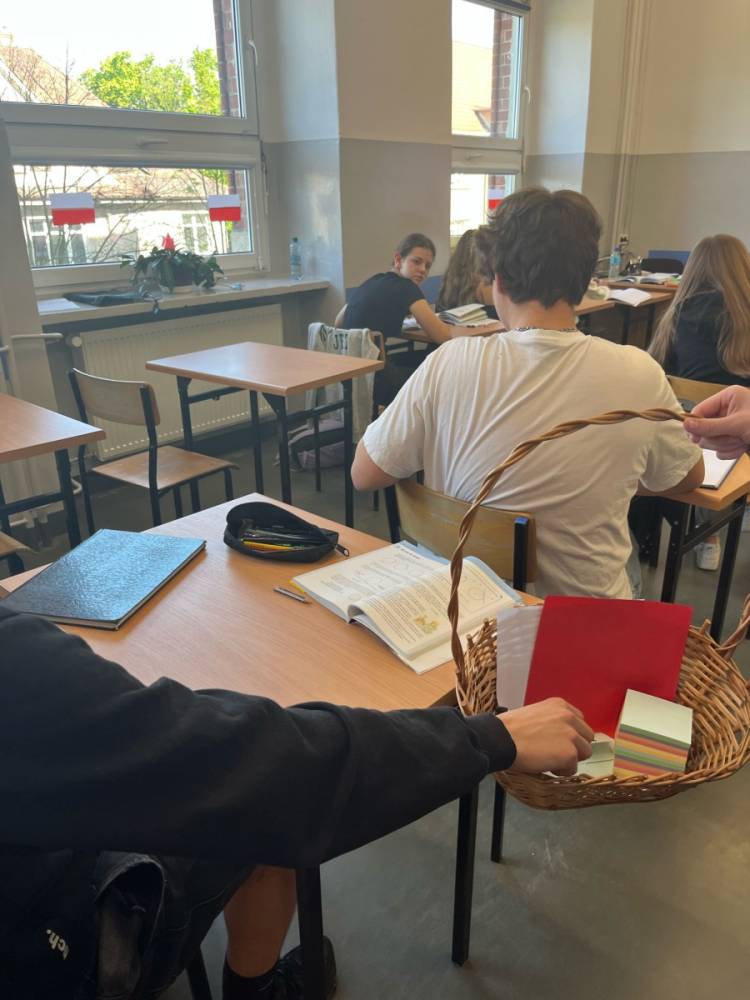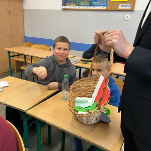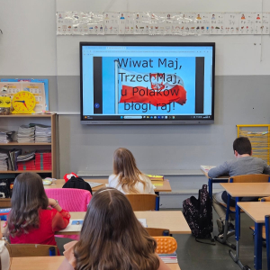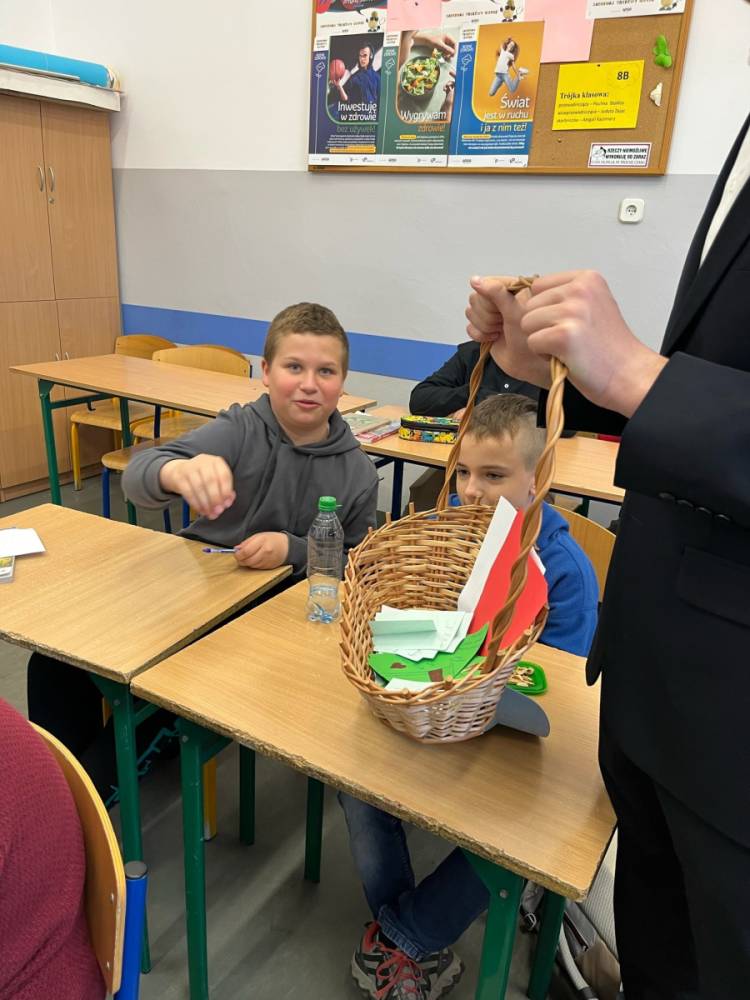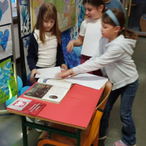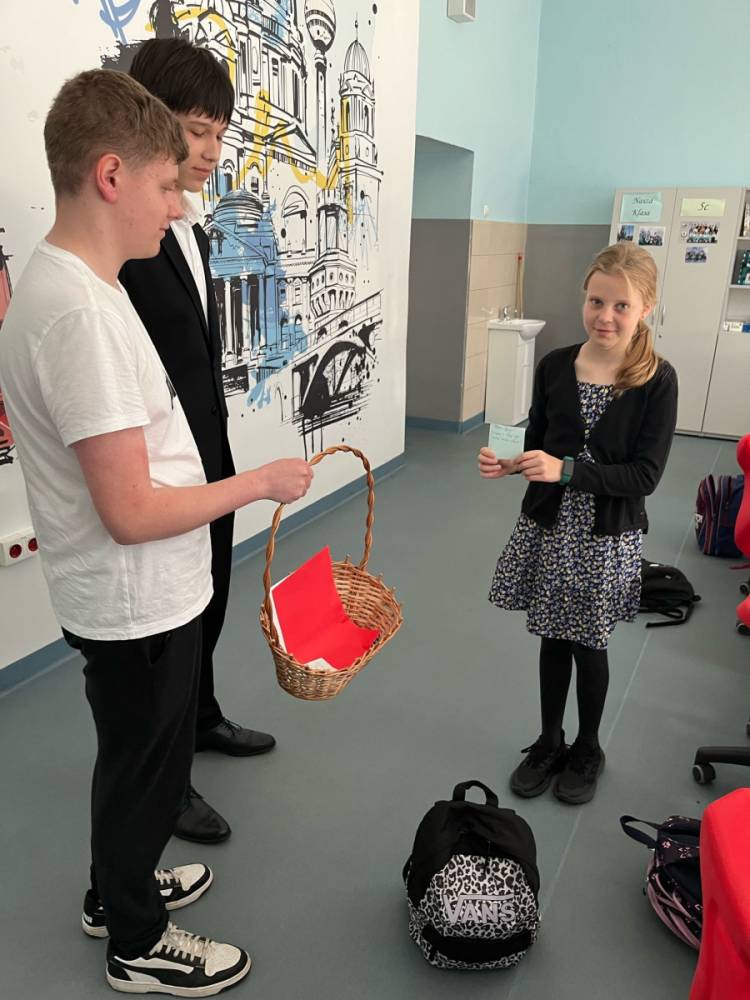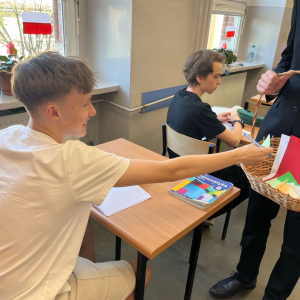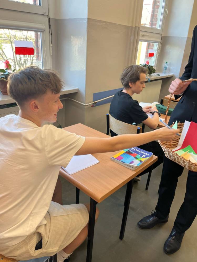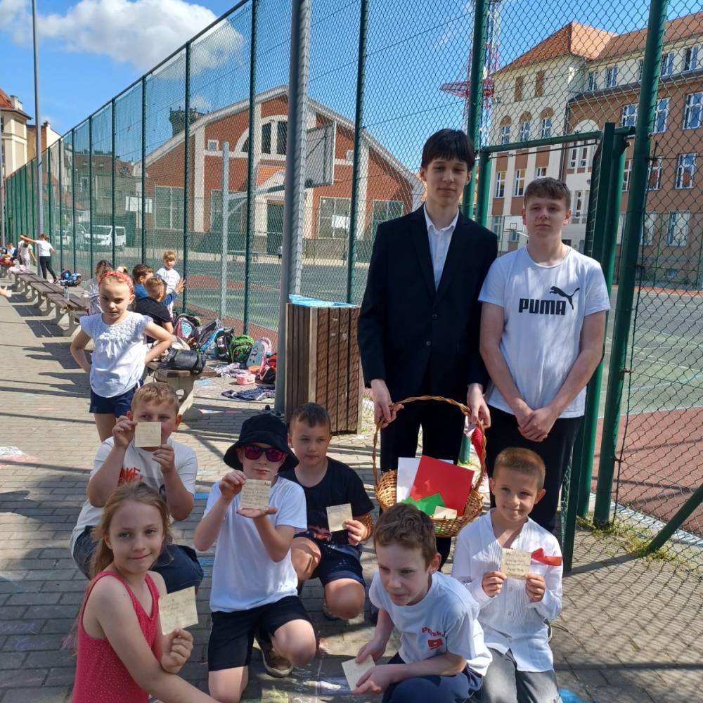 Uczniowie klas starszych wzięli udział w konkursie "Co wiesz o Konstytucji Trzeciego Maja? ". Za wykazanie się wiedzą zostali oni nagrodzeni drobnymi biało-czerwonymi i słodkimi upominkami. Dobrą zabawę całej społeczności szkolnej gwarantowały również "Patriotyczne przerwy", w trakcie których obejrzeć można było na holu I piętra wystawę dotyczącą genezy świąt majowych, specjalnie przygotowane animacje wyświetlane na "kinowym ekranie". Chętni zmierzyć się mogli z tematycznymi wykreślankami, a mali artyści - swój talent doskonalili poprzez kolorowanki.