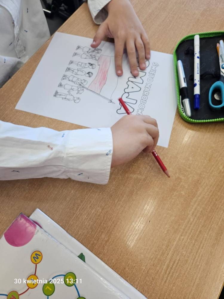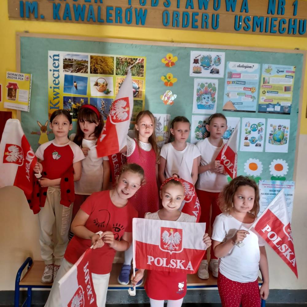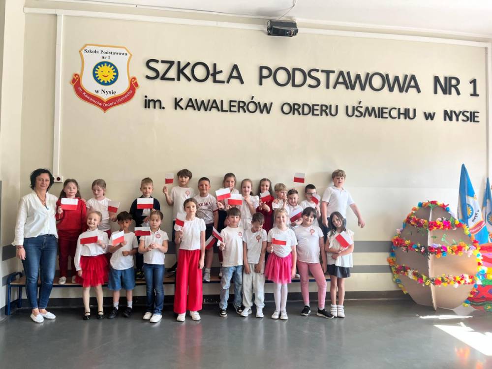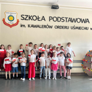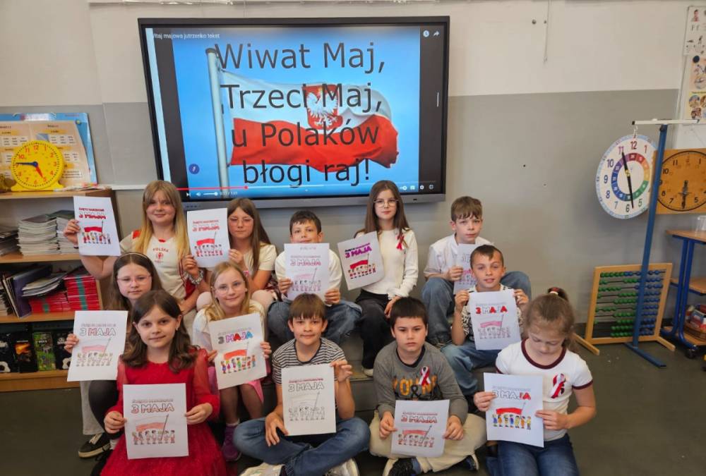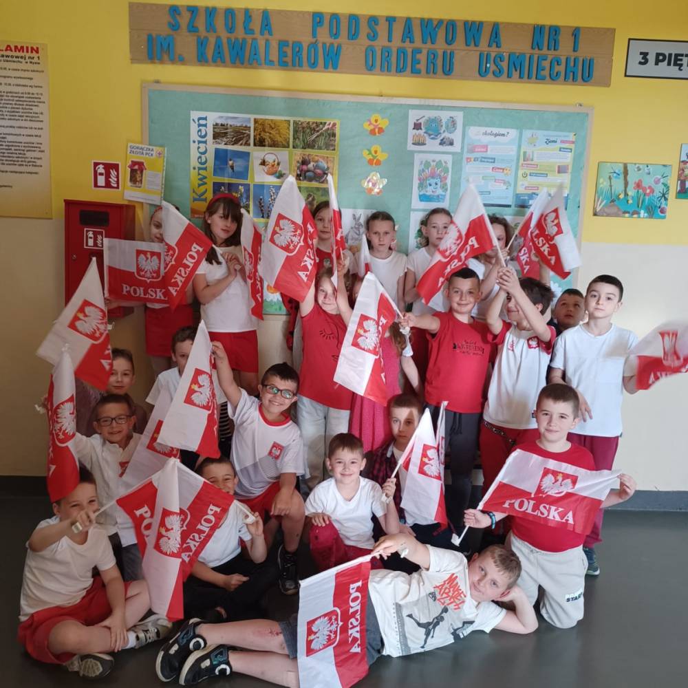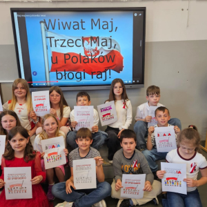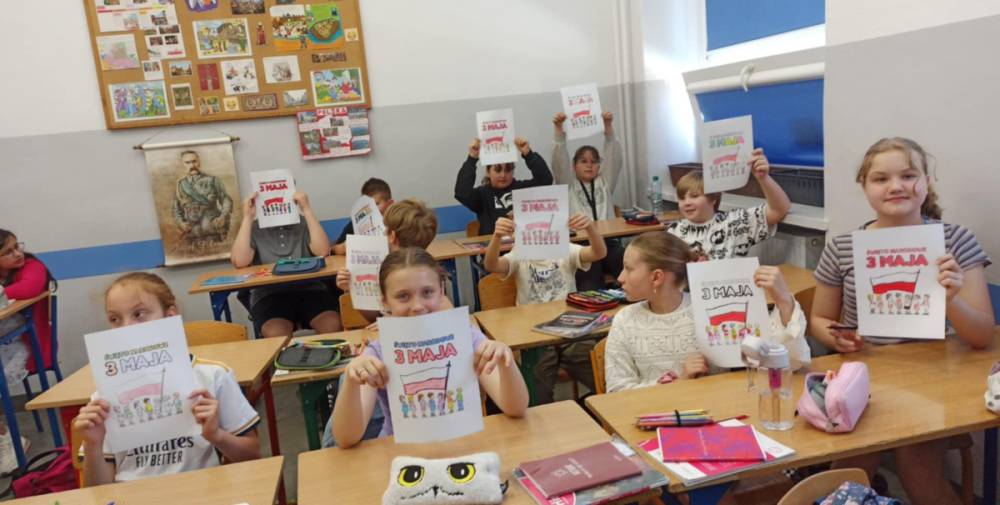 Społeczność szkolna majowe świętowanie rozpoczęła od wspólnego przystrojenia na biało-czerwono szkolnych przestrzeni i promowania postaw patriotycznych - poprzez poezję, wykonywanie papierowych flag, prac plastycznych. Ważnym elementem stał się kotylion i ubiór w barwach narodowych. A śpiewany "Mazurek Trzeciego Maja" rozbrzmiewał ze wszystkich sal lekcyjnych.