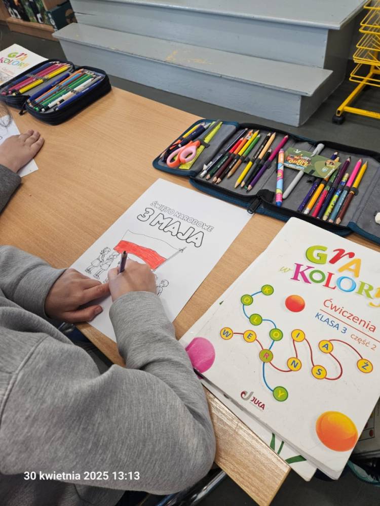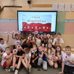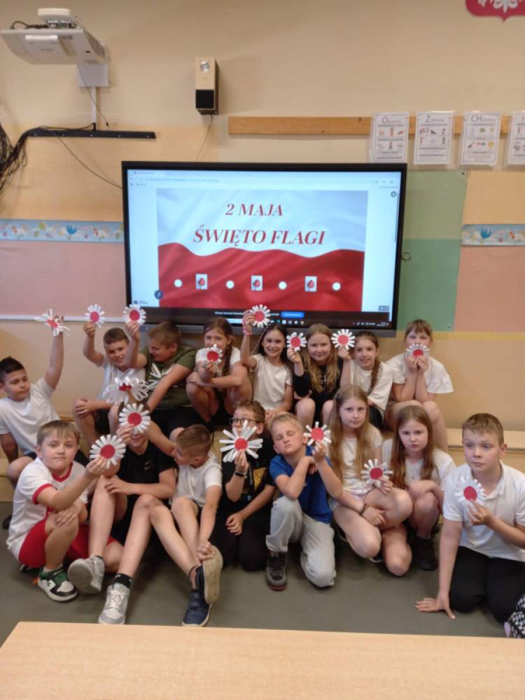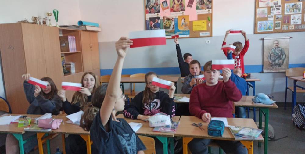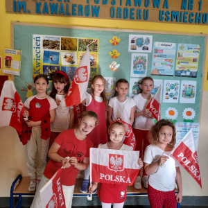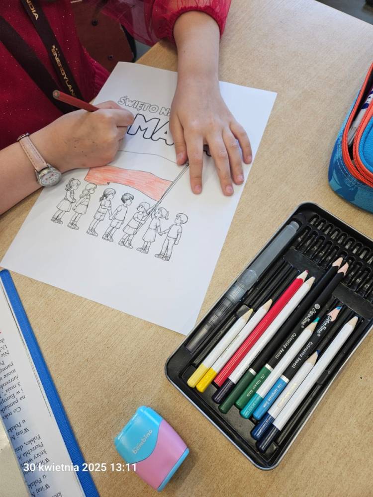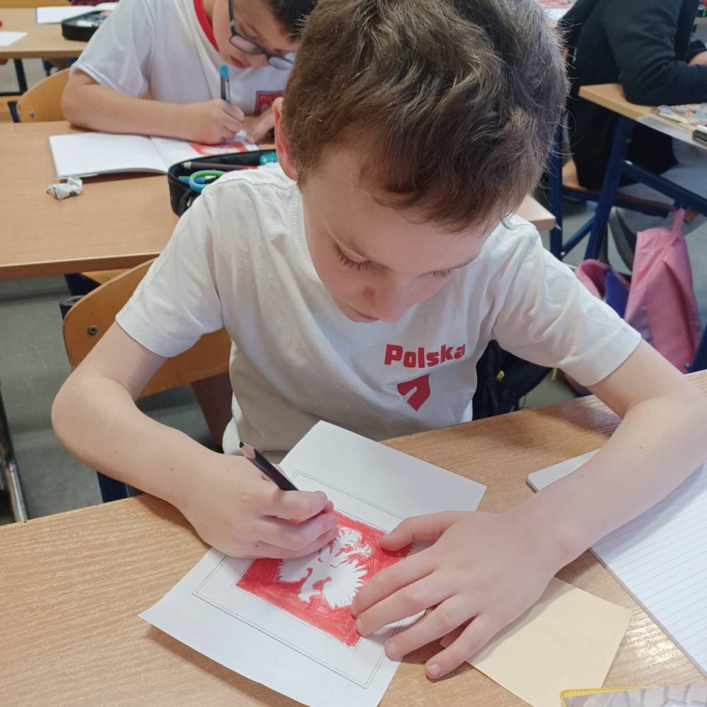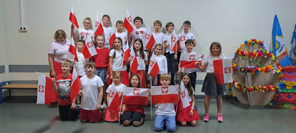 Społeczność szkolna majowe świętowanie rozpoczęła od wspólnego przystrojenia na biało-czerwono szkolnych przestrzeni i promowania postaw patriotycznych - poprzez poezję, wykonywanie papierowych flag, prac plastycznych. Ważnym elementem stał się kotylion i ubiór w barwach narodowych. A śpiewany "Mazurek Trzeciego Maja" rozbrzmiewał ze wszystkich sal lekcyjnych.