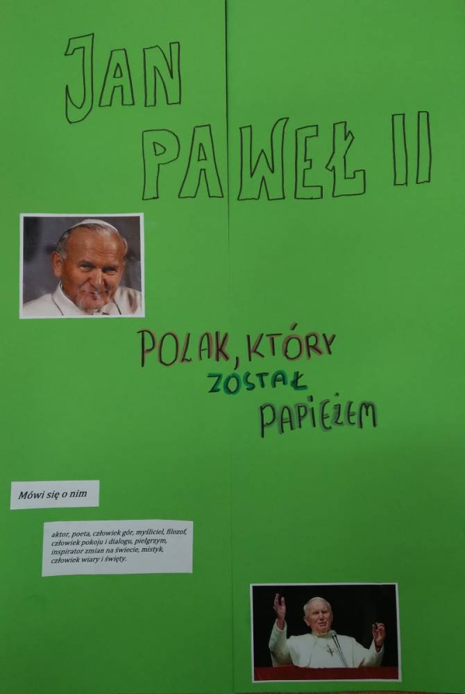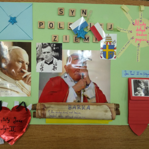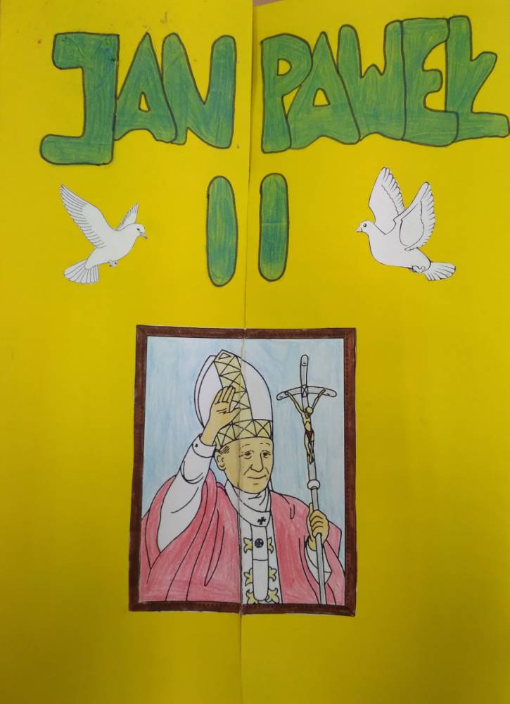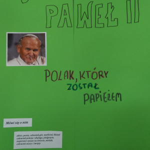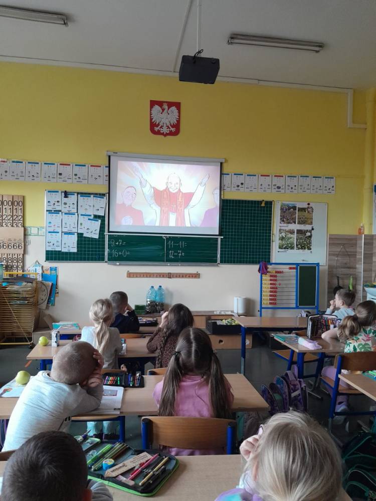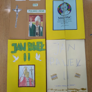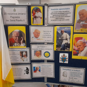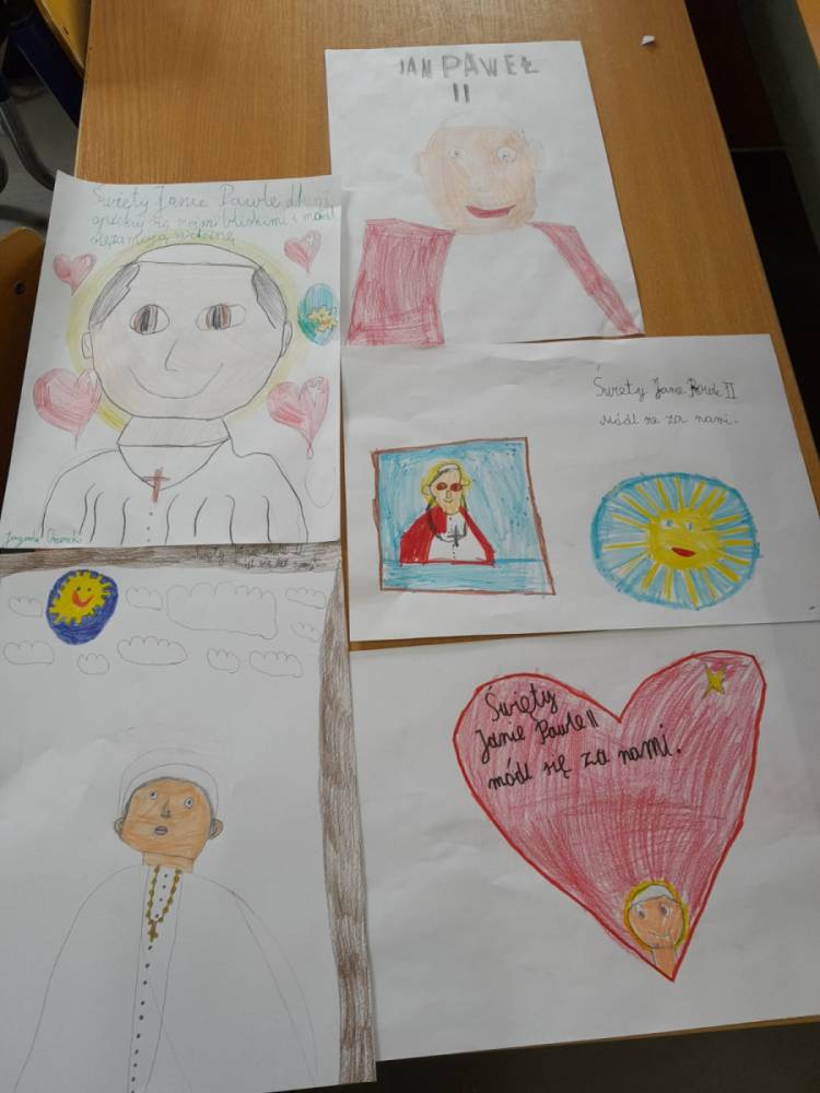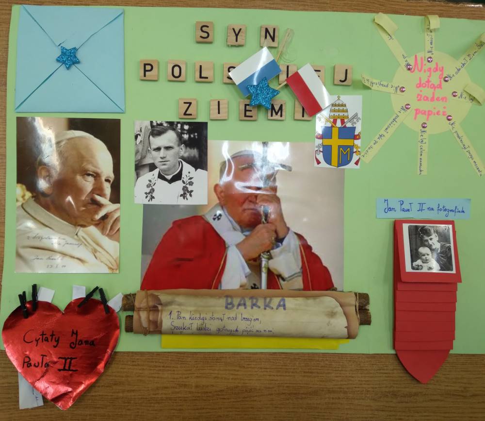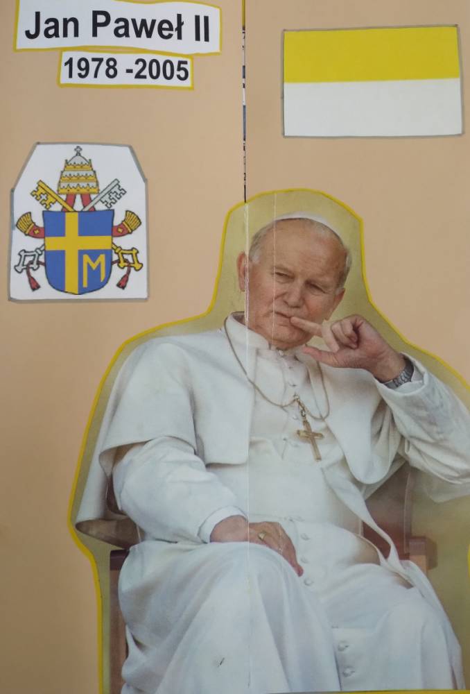 2 kwietnia obchodziliśmy 20 rocznicę śmierci Papieża św. Jana Pawła II. Z tej okazji została wykonana gazetka prezentująca pontyfikat św. Jana Pawła II, natomiast w klasach I-VIII na religii zostały przeprowadzone lekcje tematyczne. Uczniowie, poznając drogę życiową Karola Wojtyły oglądali film „Karol Wojtyła – Jan Paweł II” i prezentację multimedialną o św. Janie Pawle II, przeglądali lapbooki „Jan Paweł II – Wielki Papież” oraz wykonywali pracę plastyczną.