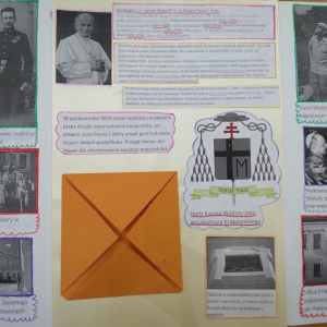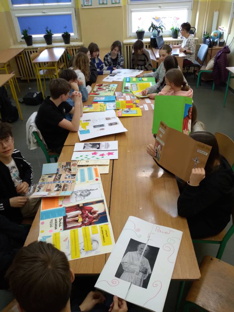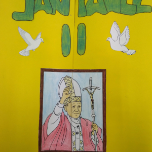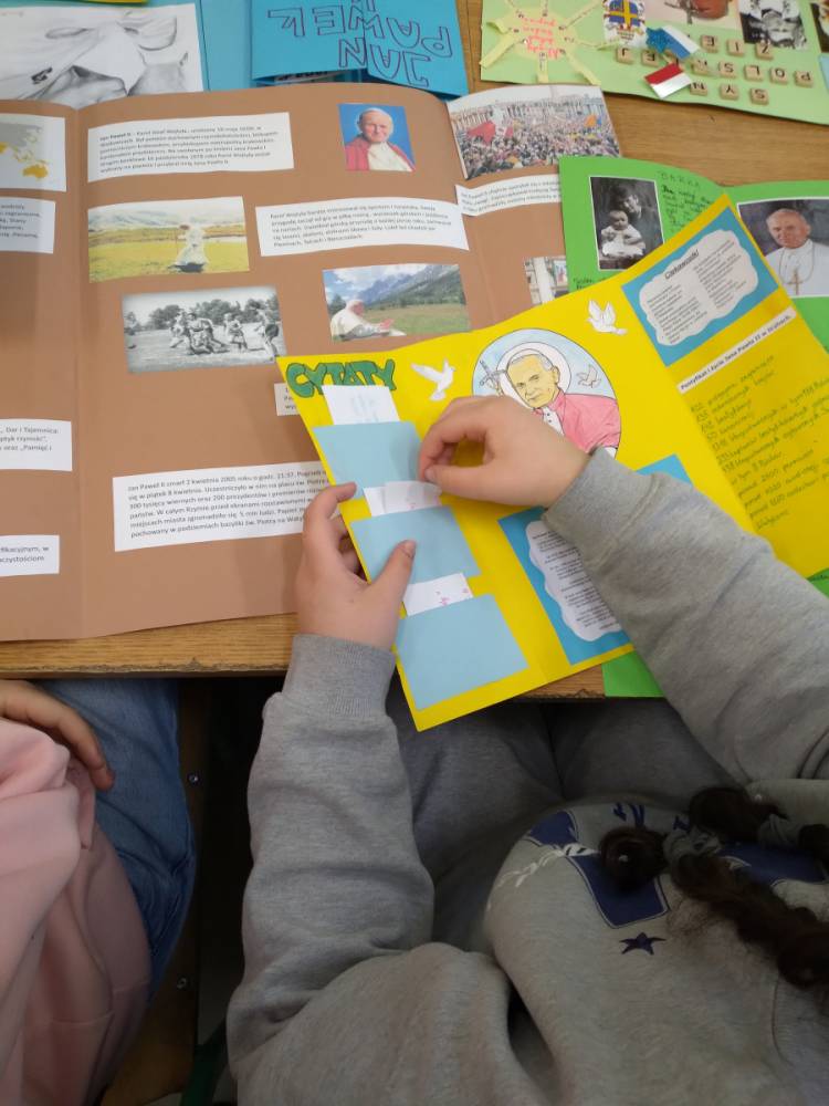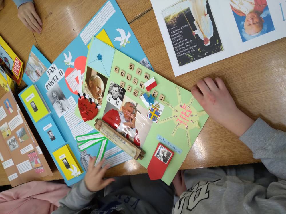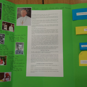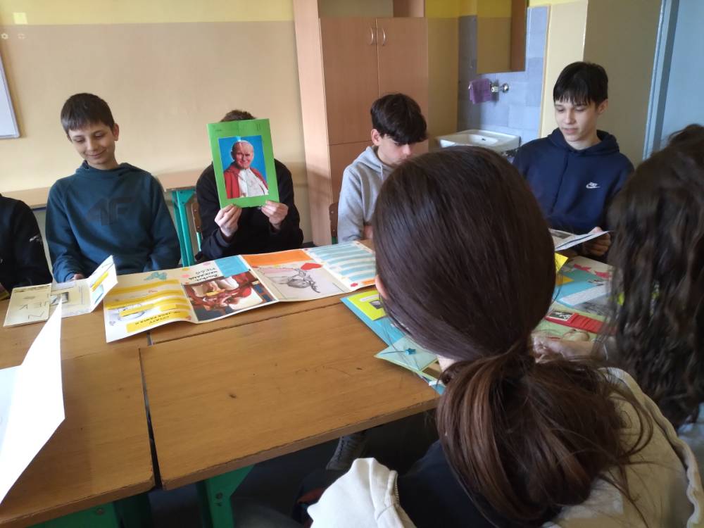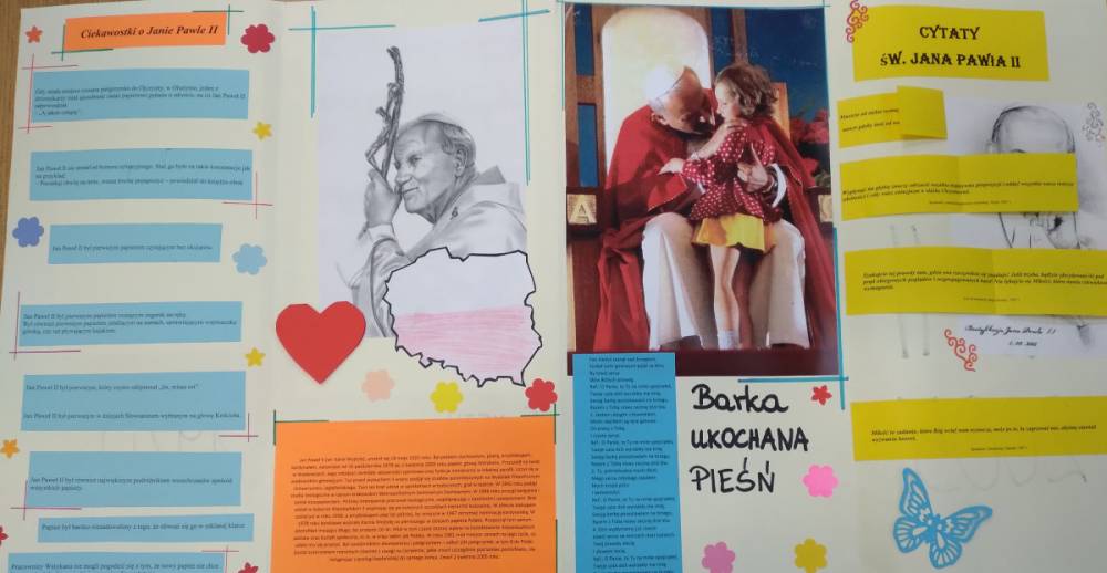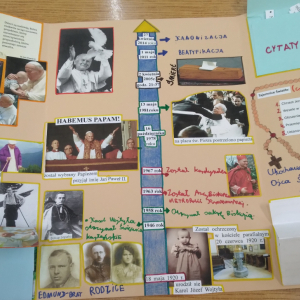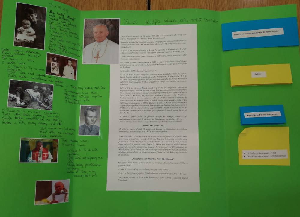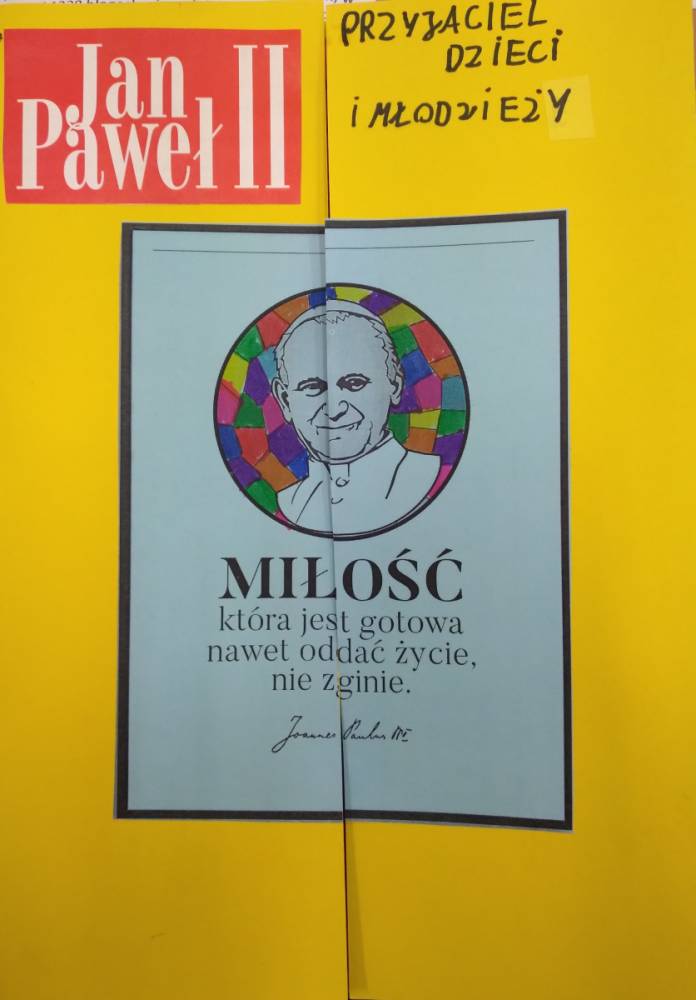 2 kwietnia obchodziliśmy 20 rocznicę śmierci Papieża św. Jana Pawła II. Z tej okazji została wykonana gazetka prezentująca pontyfikat św. Jana Pawła II, natomiast w klasach I-VIII na religii zostały przeprowadzone lekcje tematyczne. Uczniowie, poznając drogę życiową Karola Wojtyły oglądali film „Karol Wojtyła – Jan Paweł II” i prezentację multimedialną o św. Janie Pawle II, przeglądali lapbooki „Jan Paweł II – Wielki Papież” oraz wykonywali pracę plastyczną.