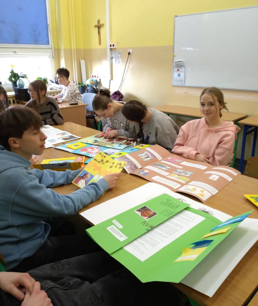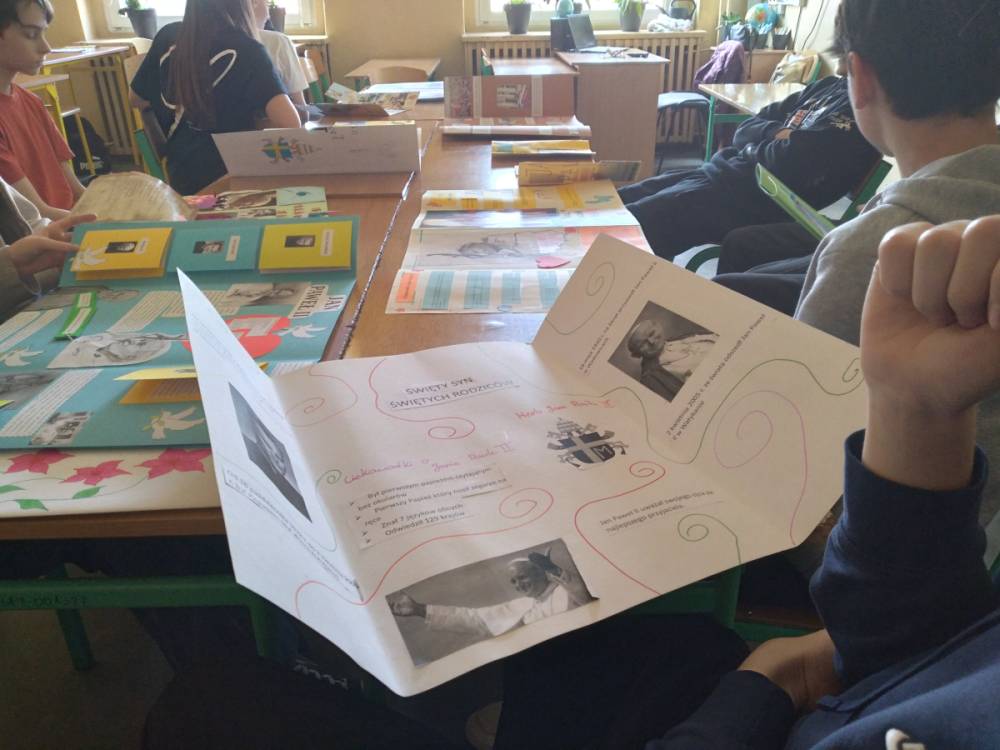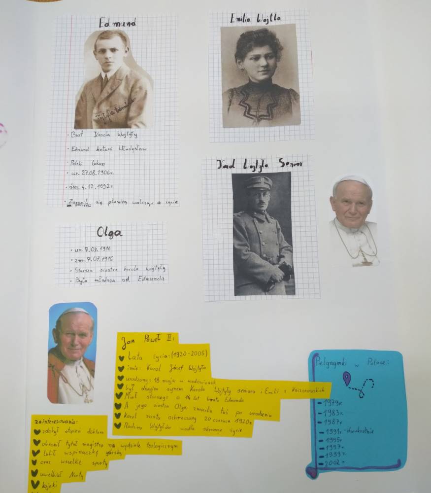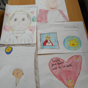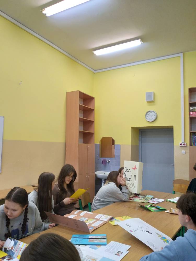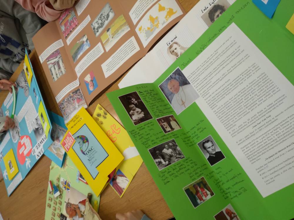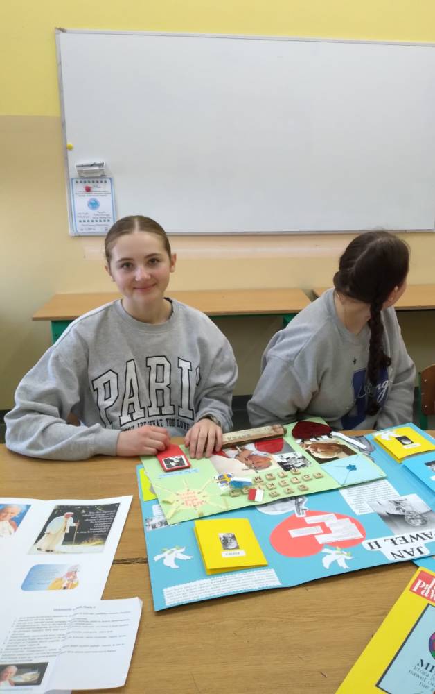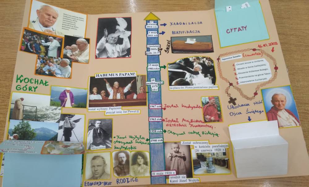 2 kwietnia obchodziliśmy 20 rocznicę śmierci Papieża św. Jana Pawła II. Z tej okazji została wykonana gazetka prezentująca pontyfikat św. Jana Pawła II, natomiast w klasach I-VIII na religii zostały przeprowadzone lekcje tematyczne. Uczniowie, poznając drogę życiową Karola Wojtyły oglądali film „Karol Wojtyła – Jan Paweł II” i prezentację multimedialną o św. Janie Pawle II, przeglądali lapbooki „Jan Paweł II – Wielki Papież” oraz wykonywali pracę plastyczną.