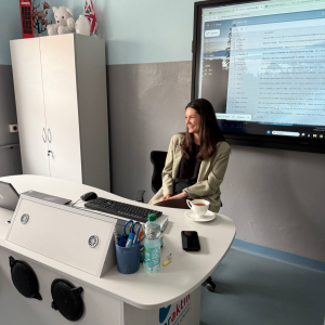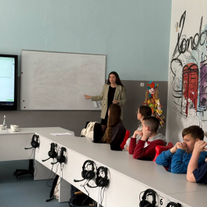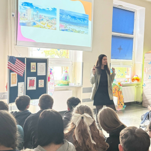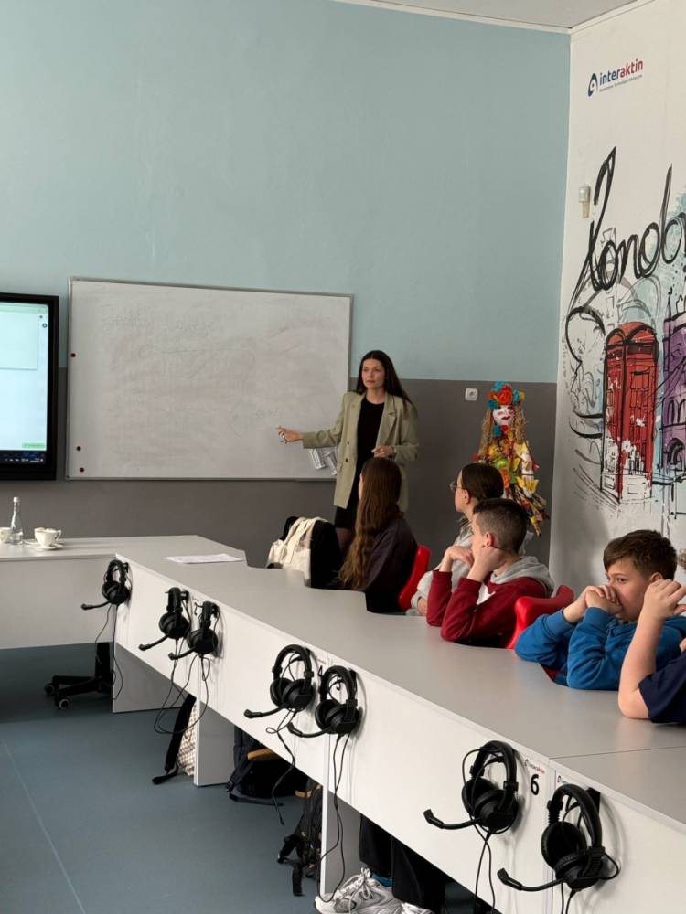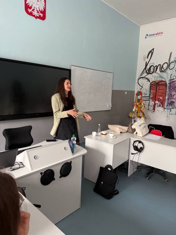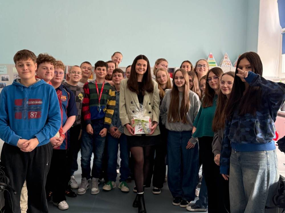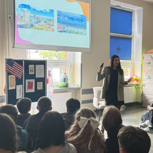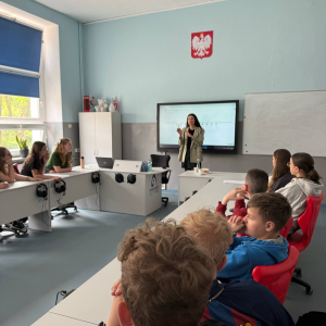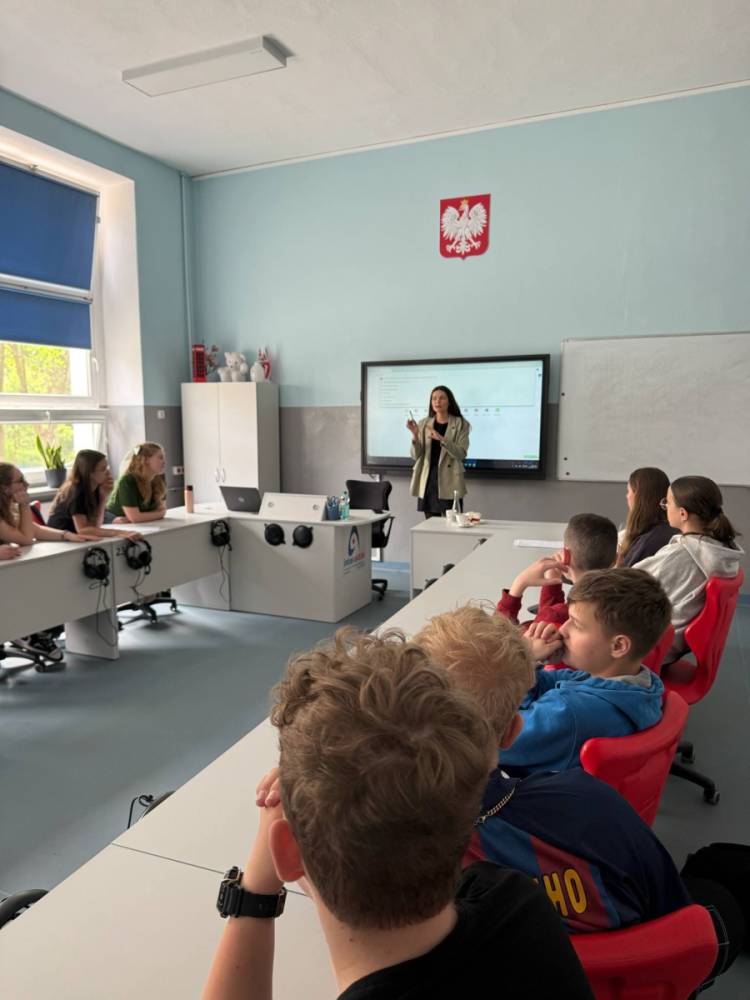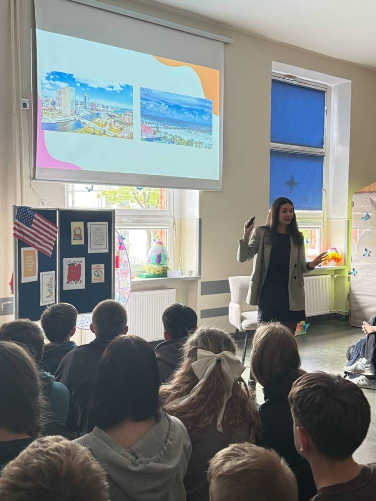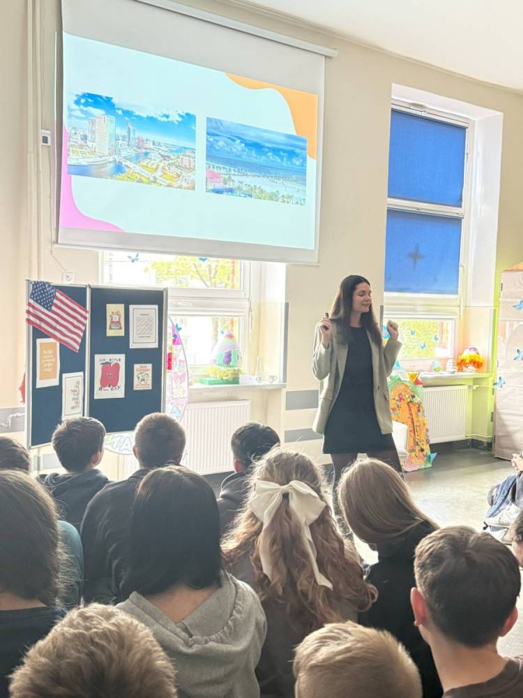 Podczas wizyty Lane spotkała się ze wszystkimi uczniami klas siódmych. W ciekawy i angażujący sposób zaprezentowała kulturę Stanów Zjednoczonych, wykorzystując atrakcyjną prezentację multimedialną. Uczniowie mieli okazję posłuchać ciekawostek o codziennym życiu Amerykanów, tradycjach, świętach oraz systemie edukacji w USA. Lane poprowadziła także zajęcia konwersacyjne z klasą VIIa. Spotkanie było doskonałą okazją do praktycznego wykorzystania języka angielskiego oraz przełamywania barier językowych. Uczniowie z entuzjazmem uczestniczyli w ćwiczeniach i chętnie zadawali pytania, rozwijając swoje umiejętności komunikacyjne. Spotkanie z Lane Johansen było nie tylko ciekawym doświadczeniem kulturowym, ale także inspirującą lekcją, która na długo pozostanie w pamięci.