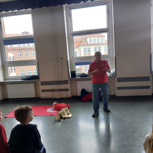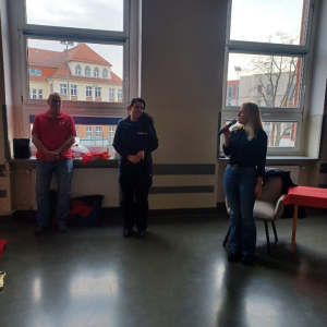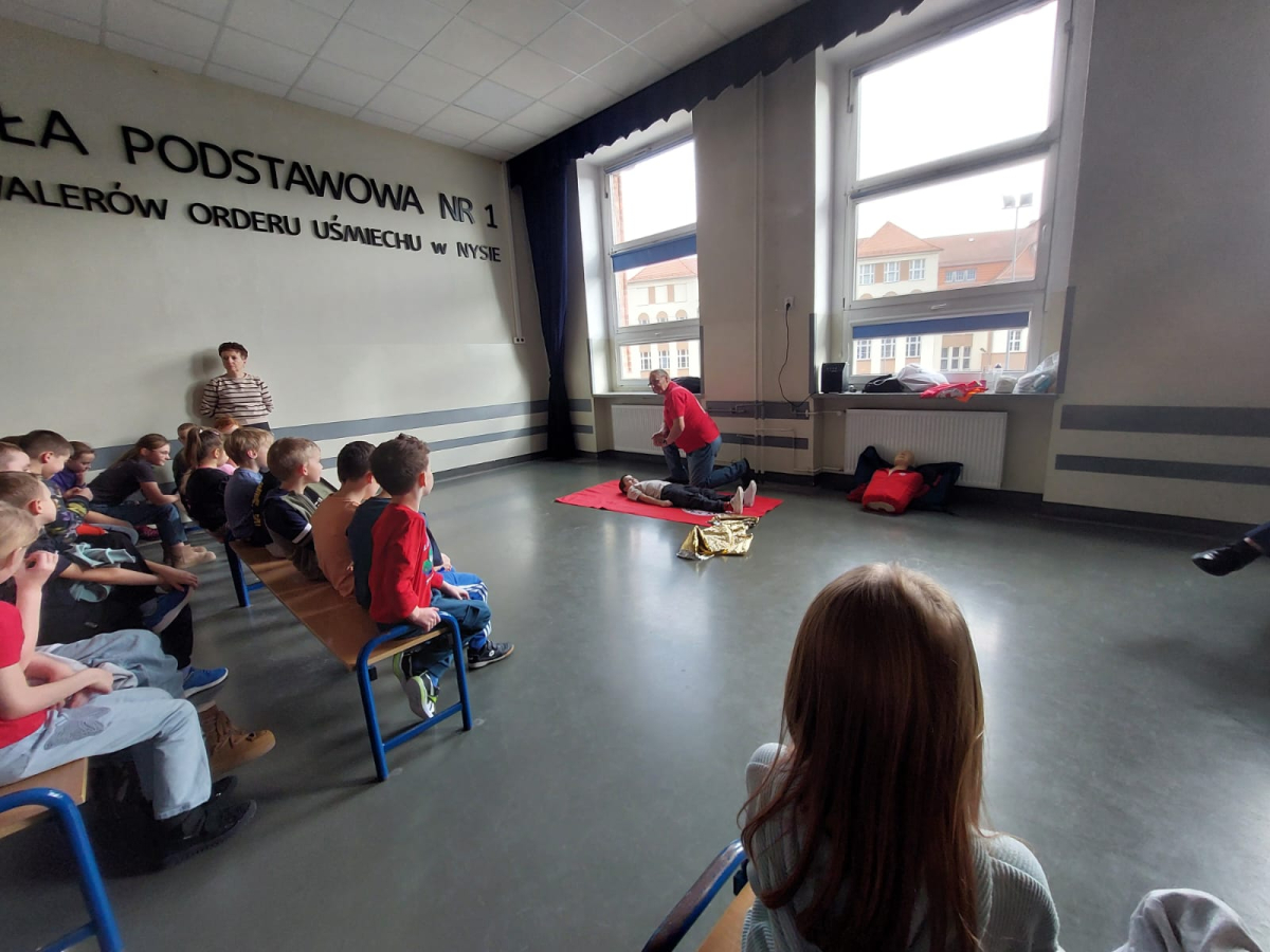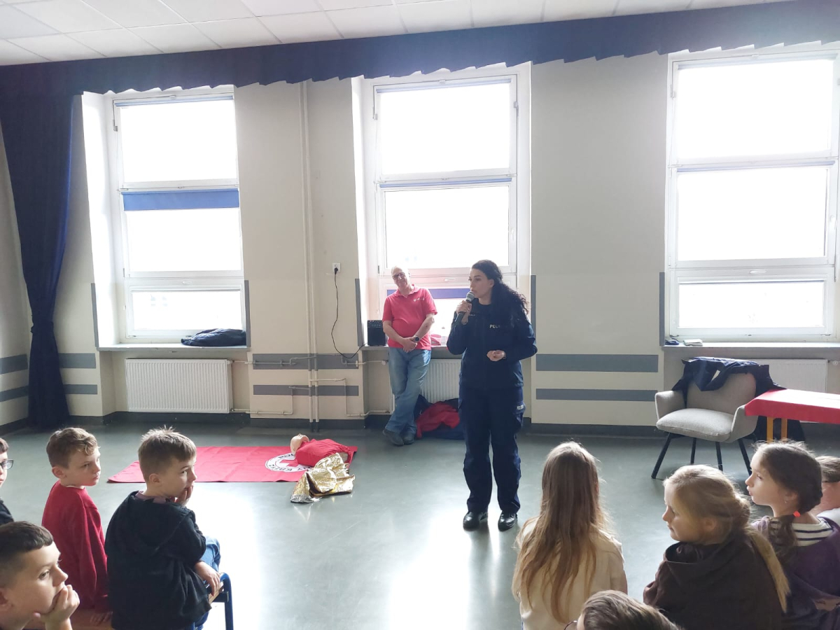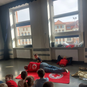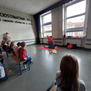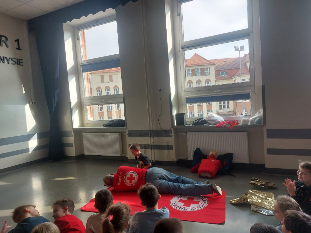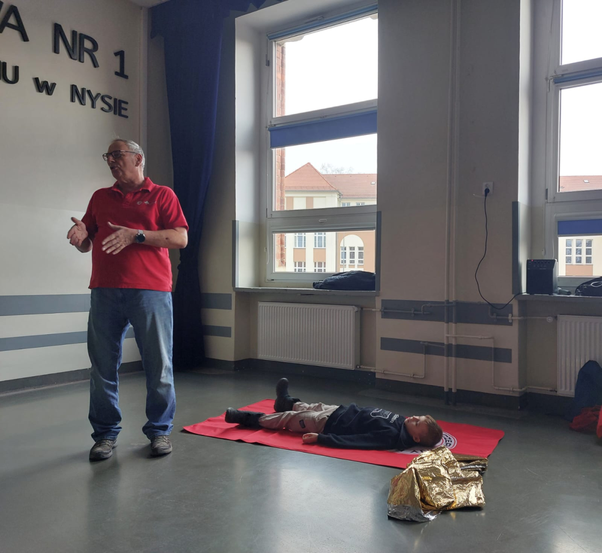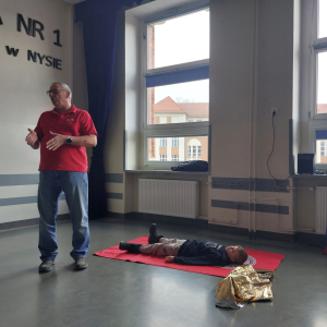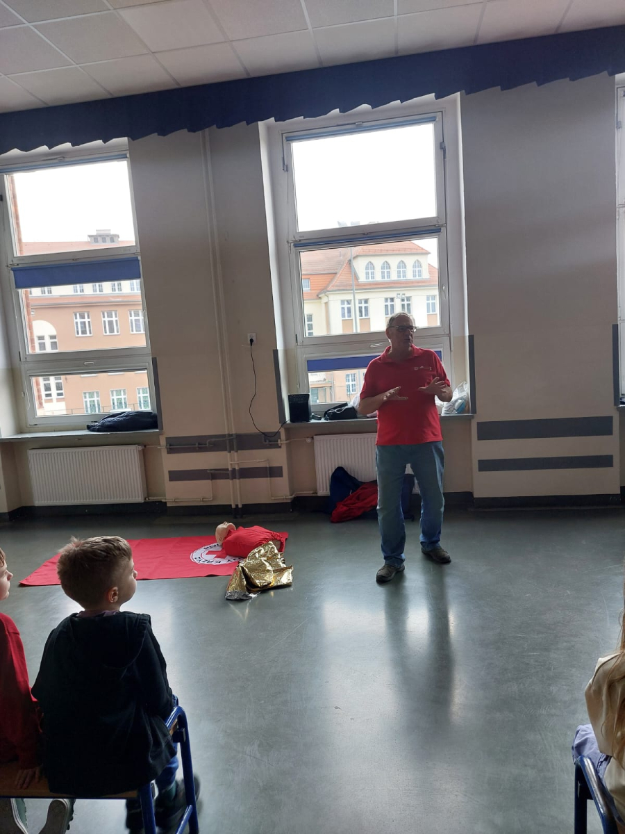 Drugim naszym gościem był przedstawiciel Polskiego Czerwonego Krzyża pan Marek Flakowski, który przedstawił zasady udzielania pierwszej pomocy i przypomniał jak ważna jest szybka i właściwa reakcja w sytuacjach zagrożenia życia.