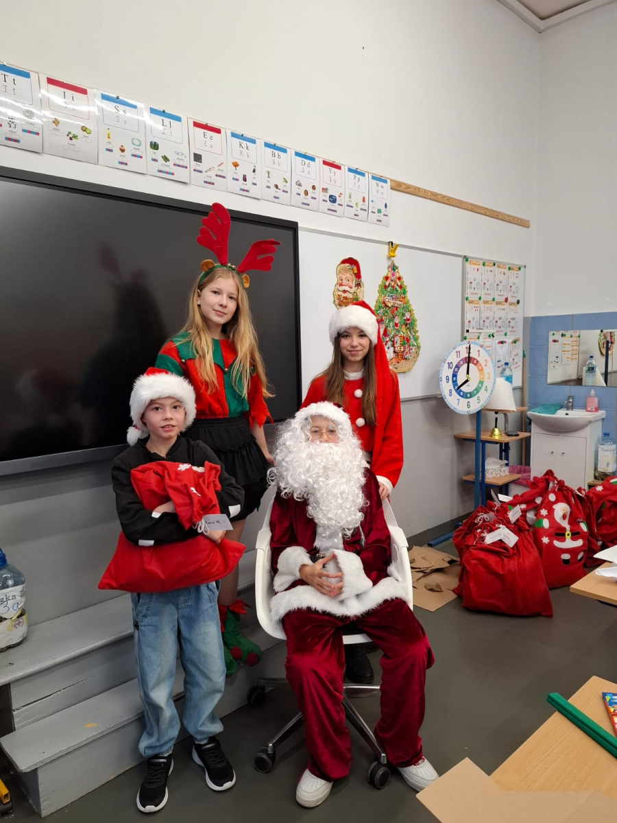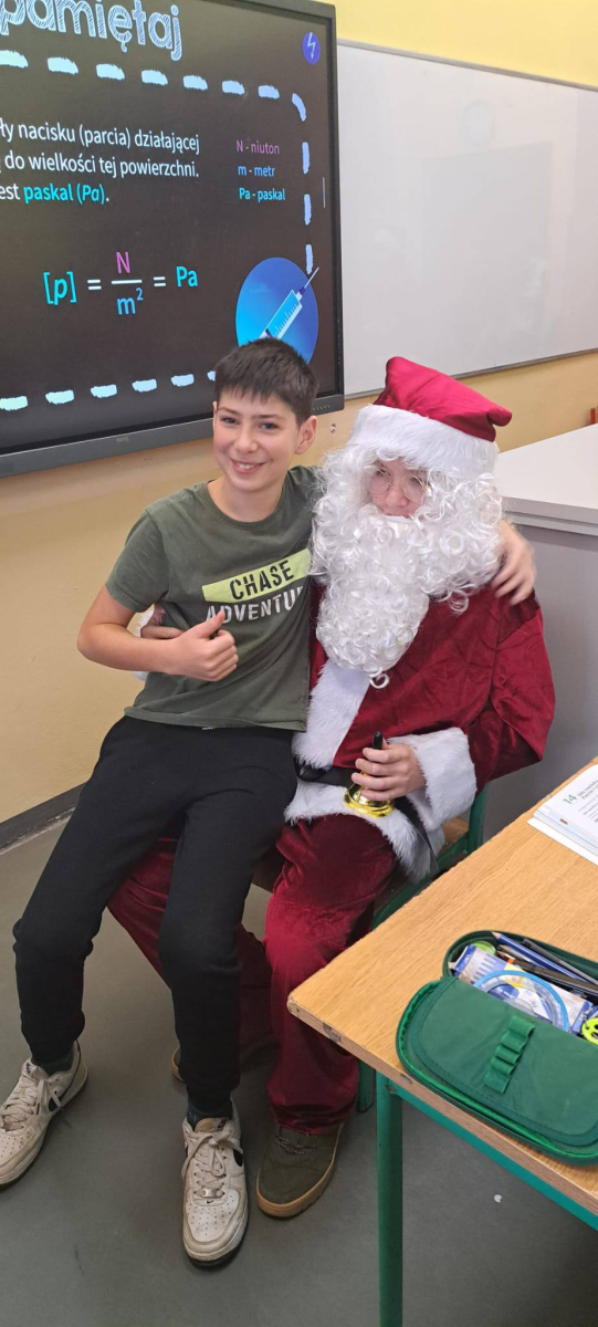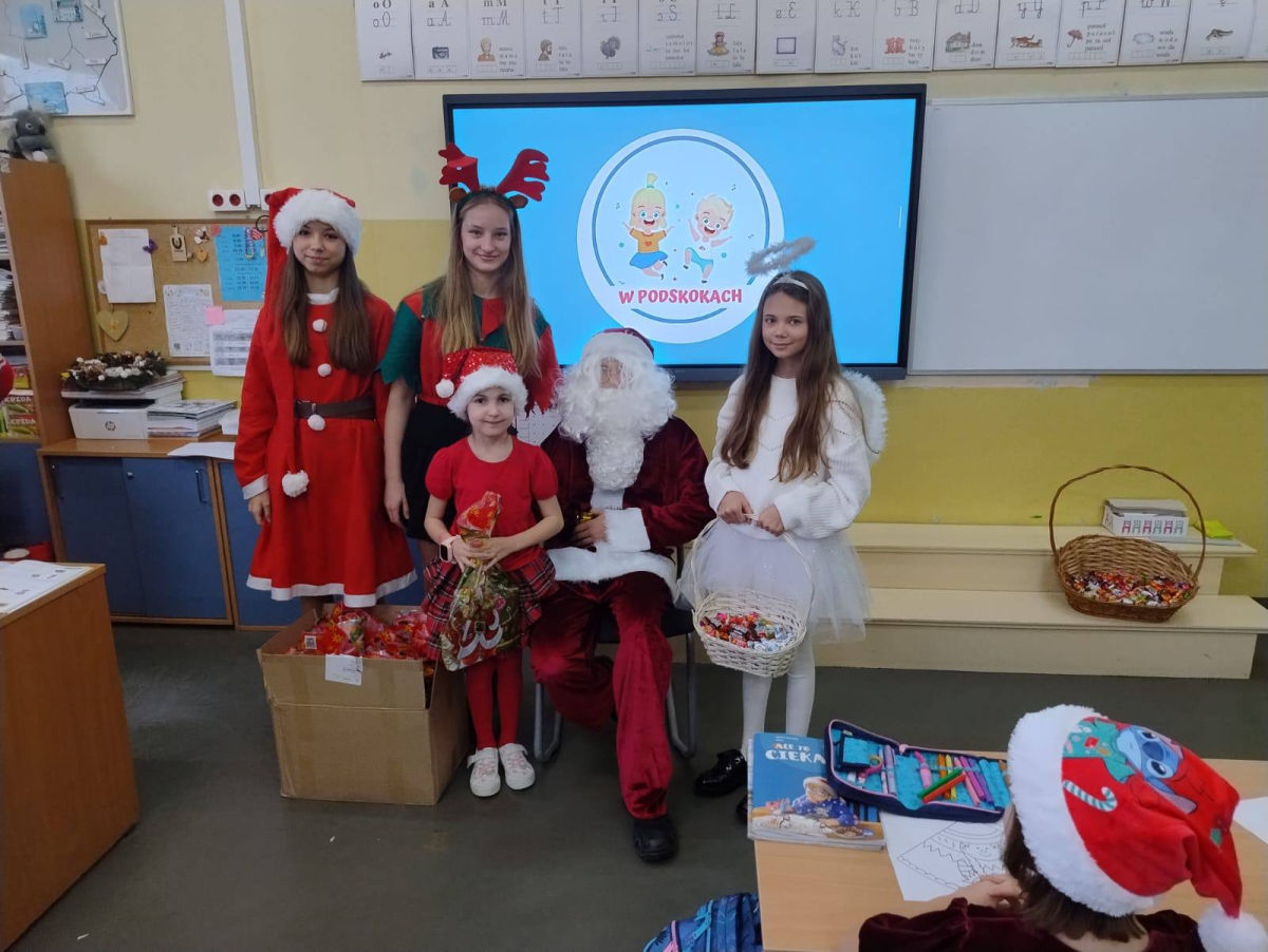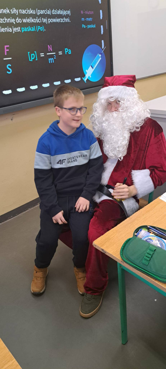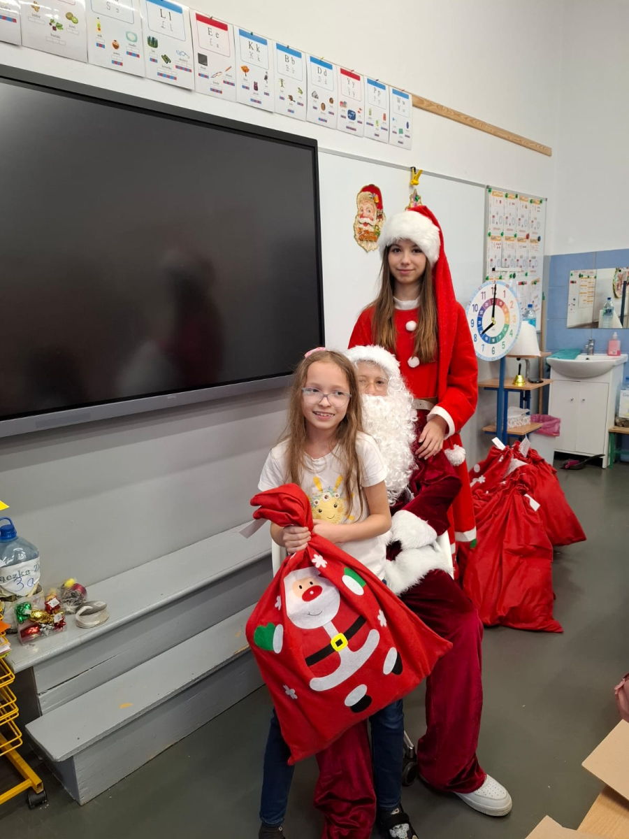 Największą atrakcją był oczywiście gość specjalny – Święty Mikołaj, który ze swoją wesołą drużyną odwiedzał sale. Pojawiali się w drzwiach z dźwiękiem dzwonków, wywołując w klasach prawdziwą radość.