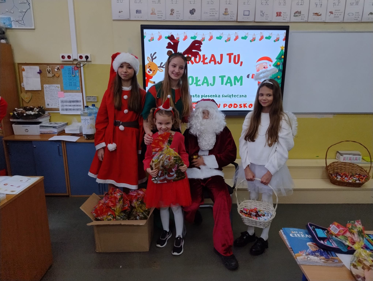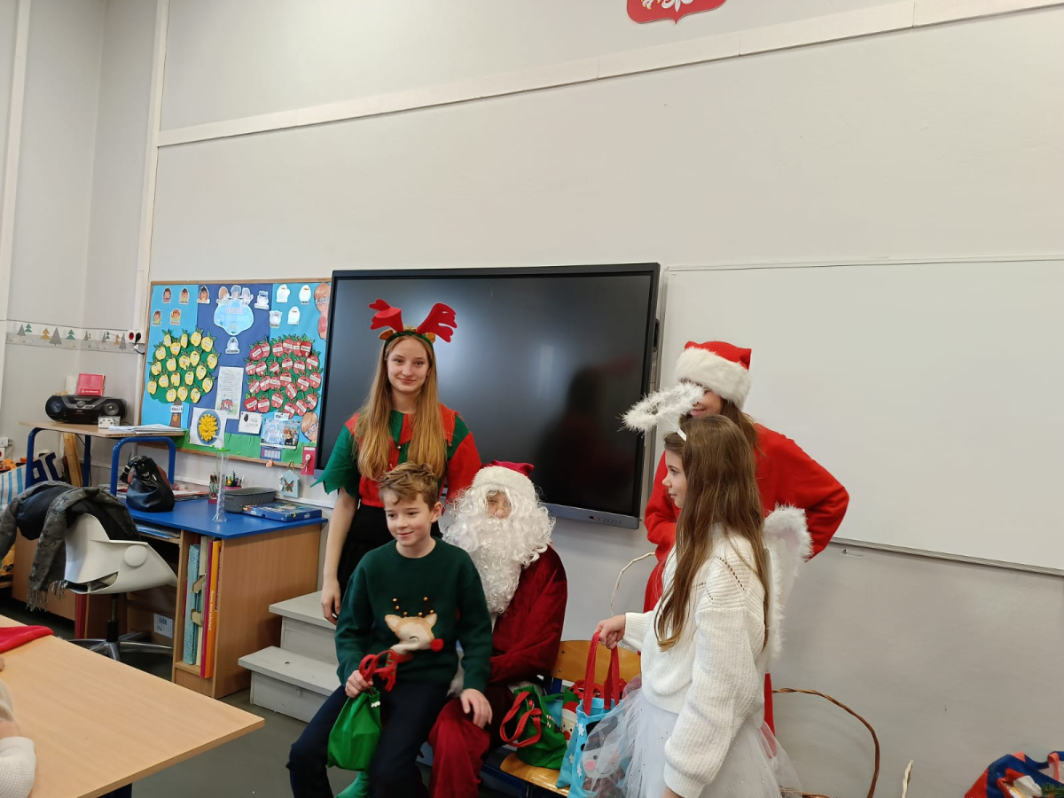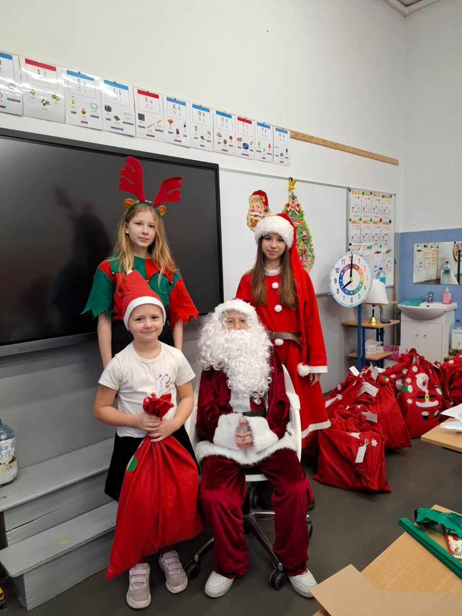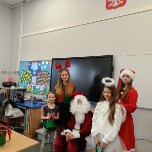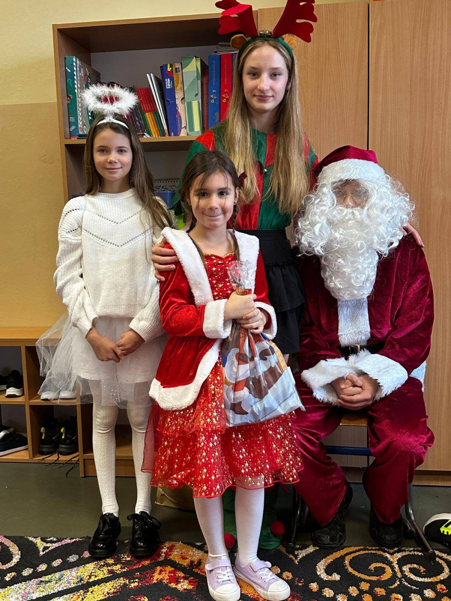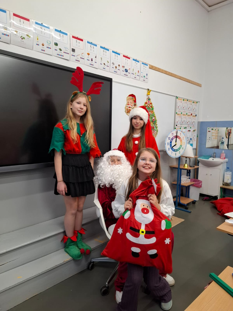 Największą atrakcją był oczywiście gość specjalny – Święty Mikołaj, który ze swoją wesołą drużyną odwiedzał sale. Pojawiali się w drzwiach z dźwiękiem dzwonków, wywołując w klasach prawdziwą radość.