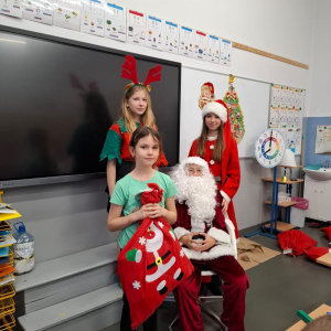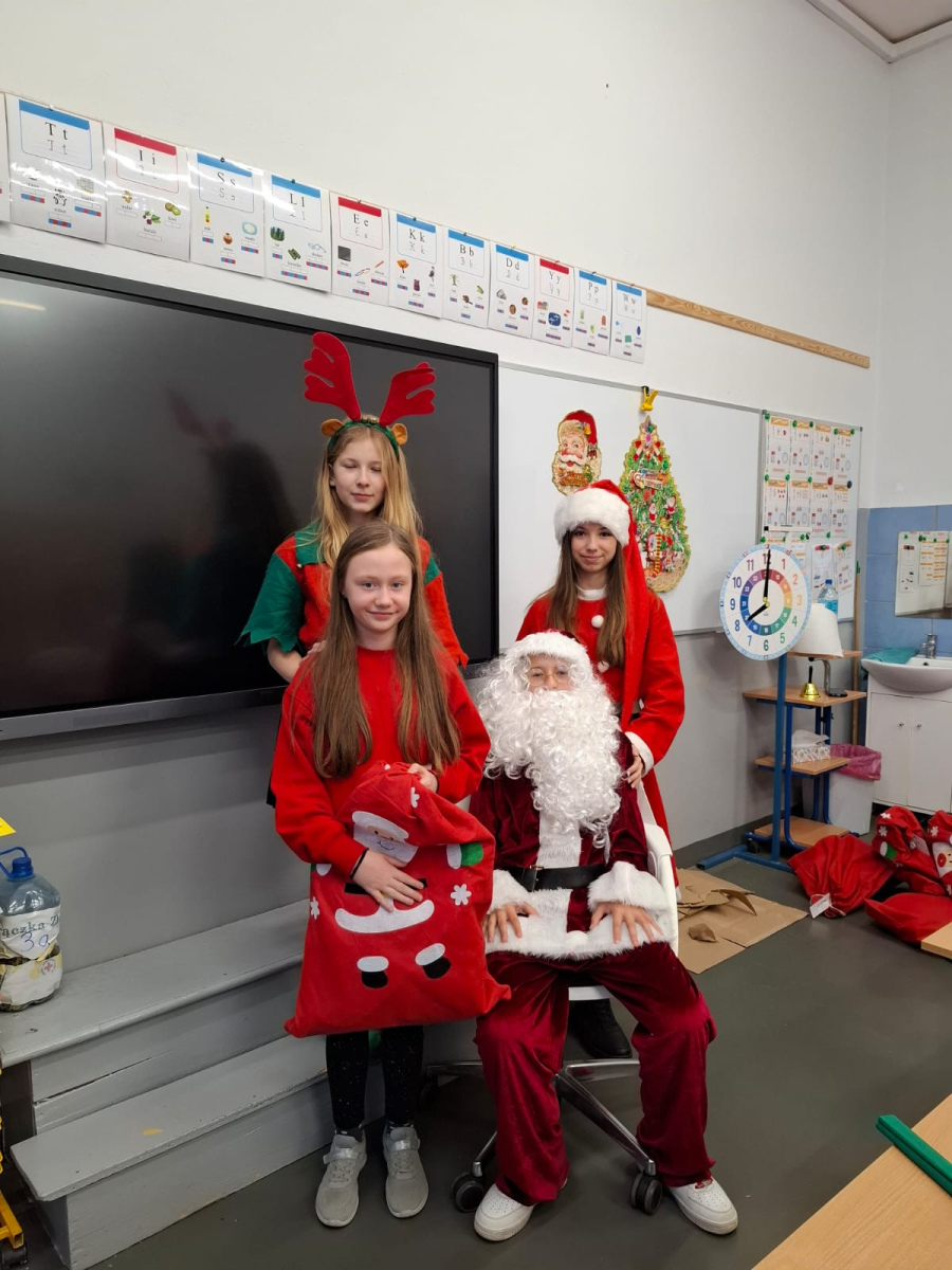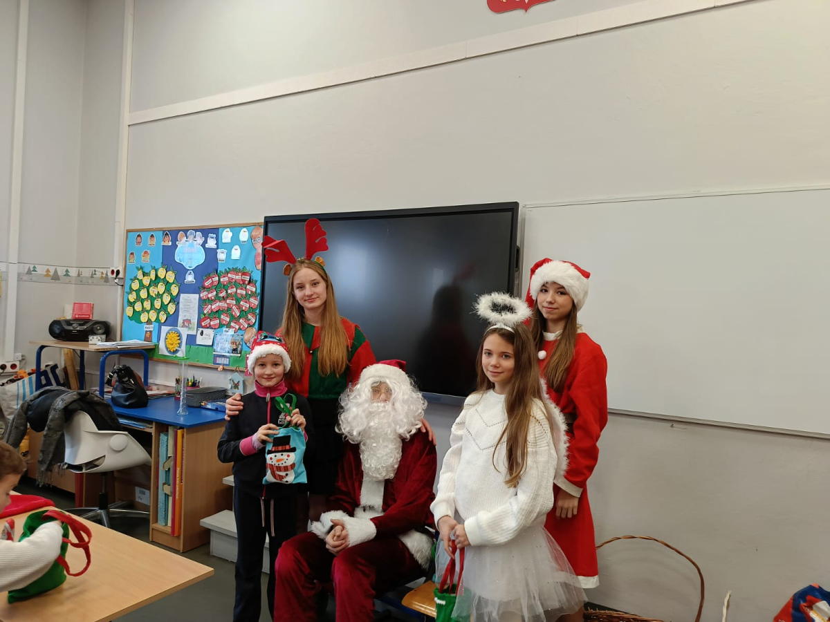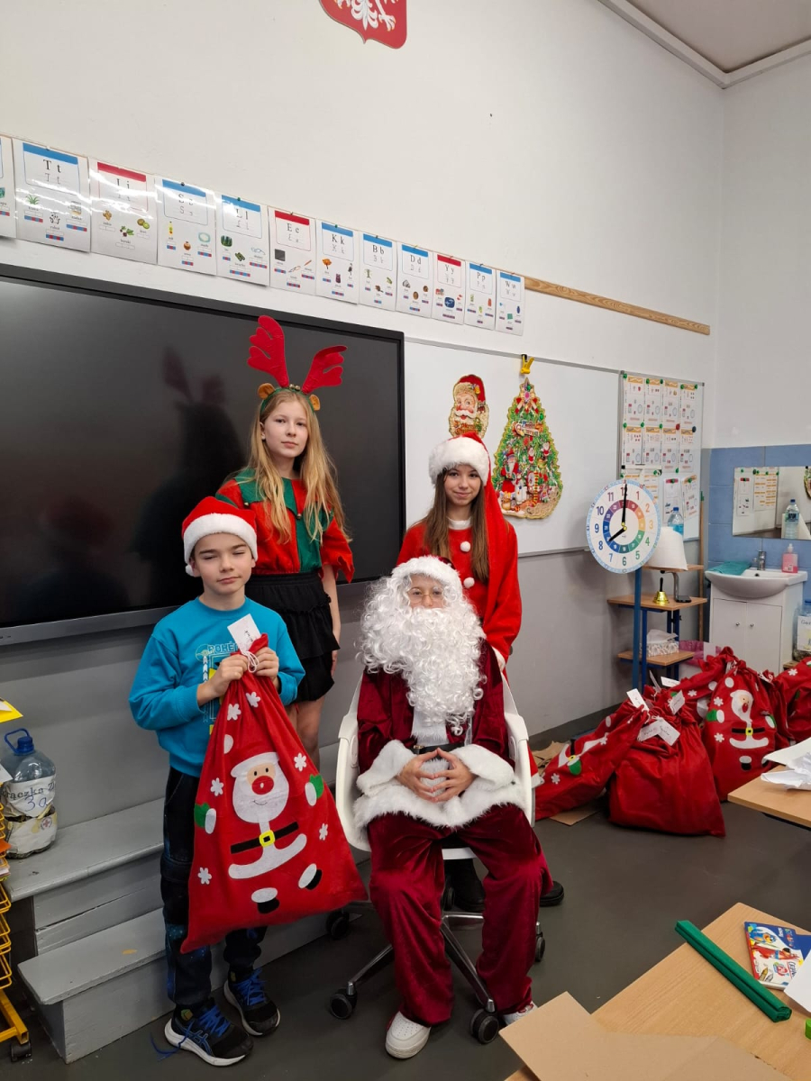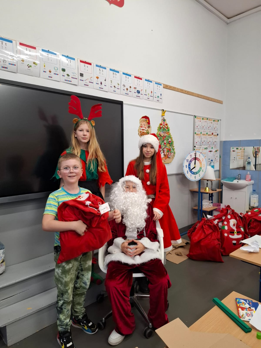 Największą atrakcją był oczywiście gość specjalny – Święty Mikołaj, który ze swoją wesołą drużyną odwiedzał sale. Pojawiali się w drzwiach z dźwiękiem dzwonków, wywołując w klasach prawdziwą radość.