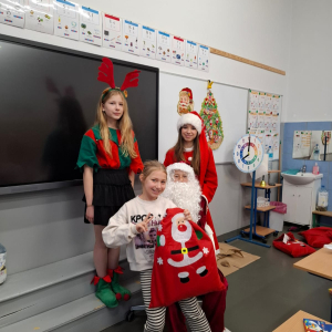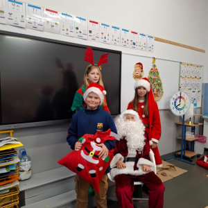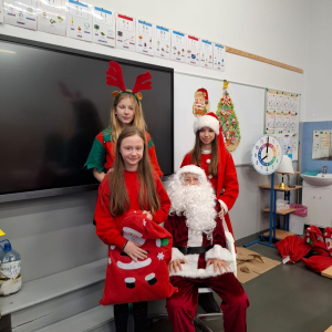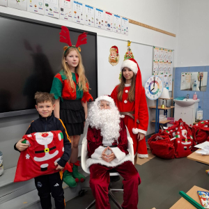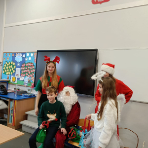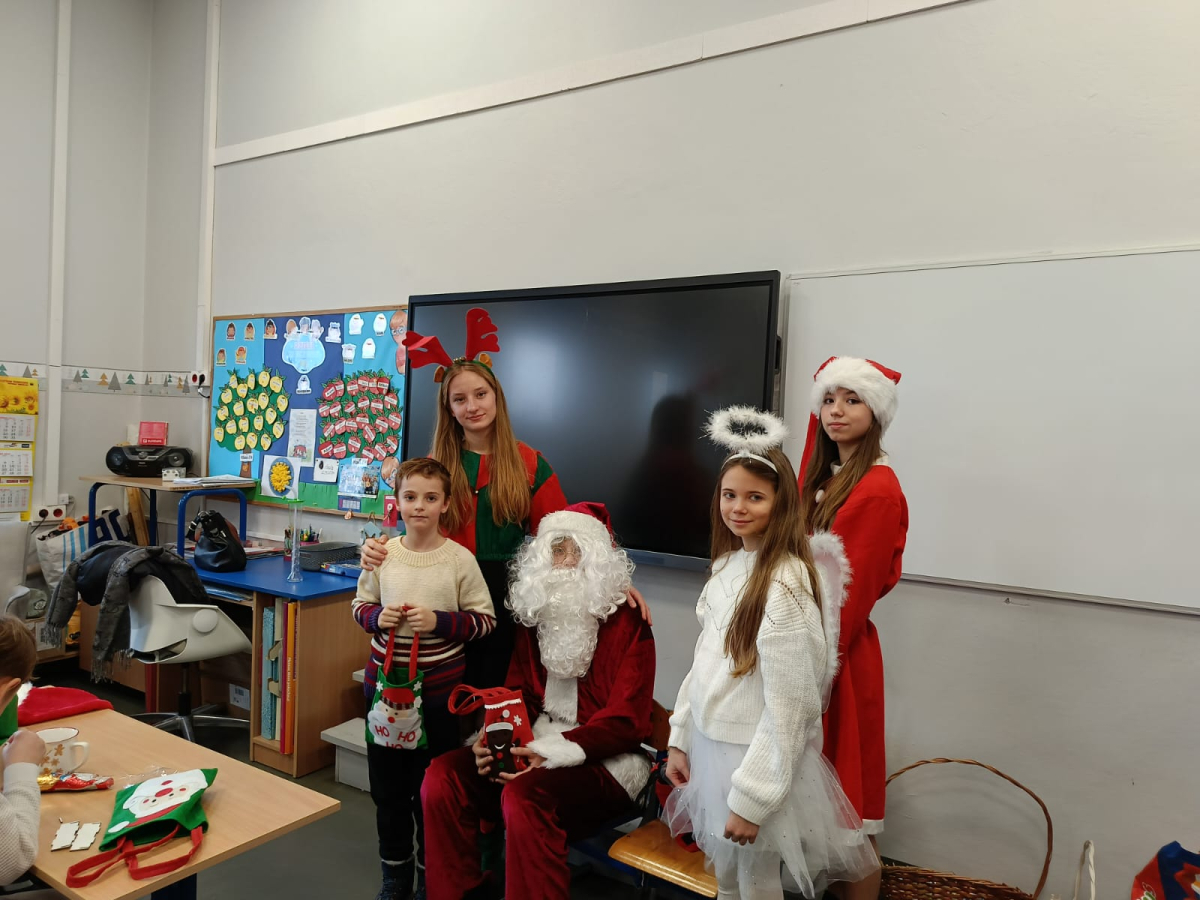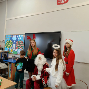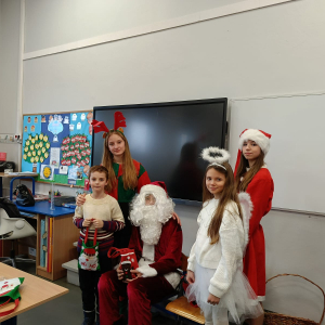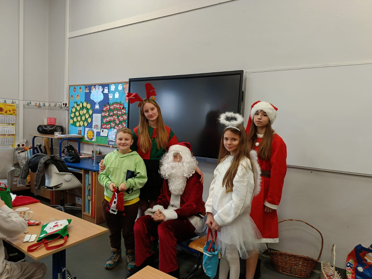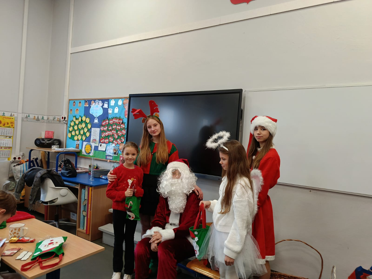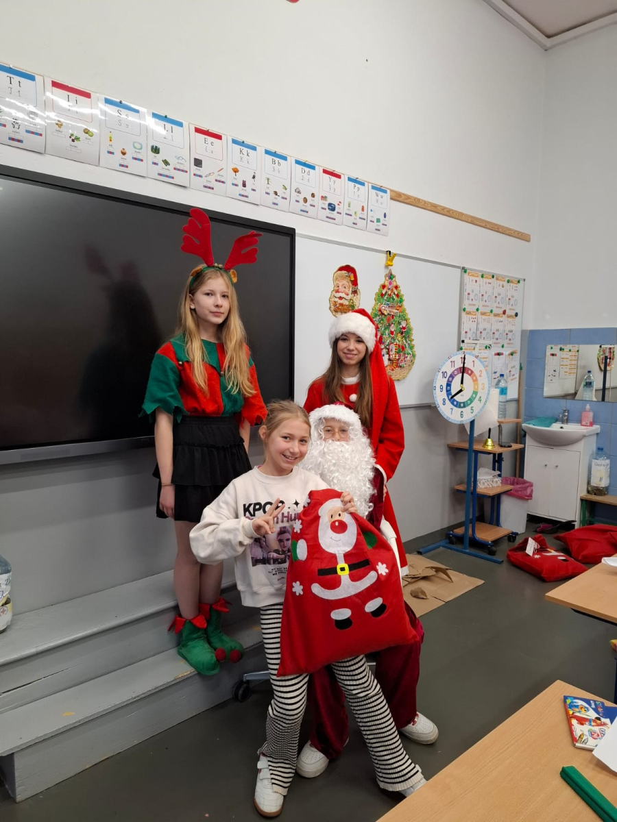 Największą atrakcją był oczywiście gość specjalny – Święty Mikołaj, który ze swoją wesołą drużyną odwiedzał sale. Pojawiali się w drzwiach z dźwiękiem dzwonków, wywołując w klasach prawdziwą radość.