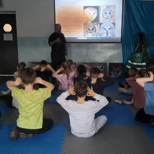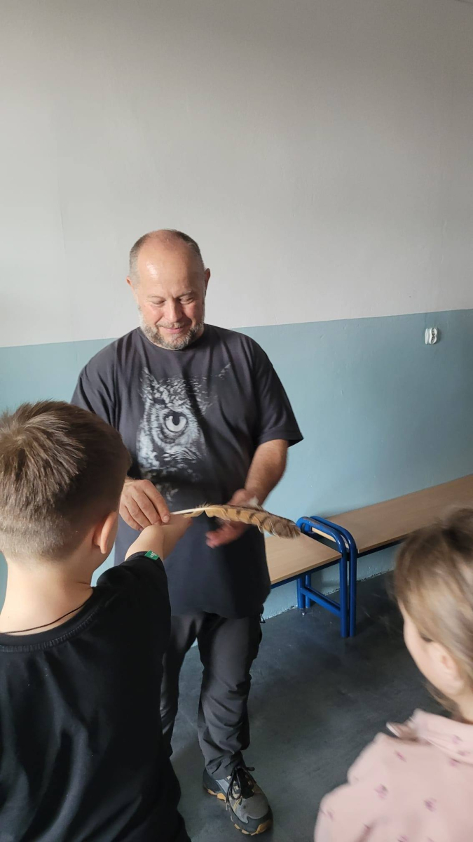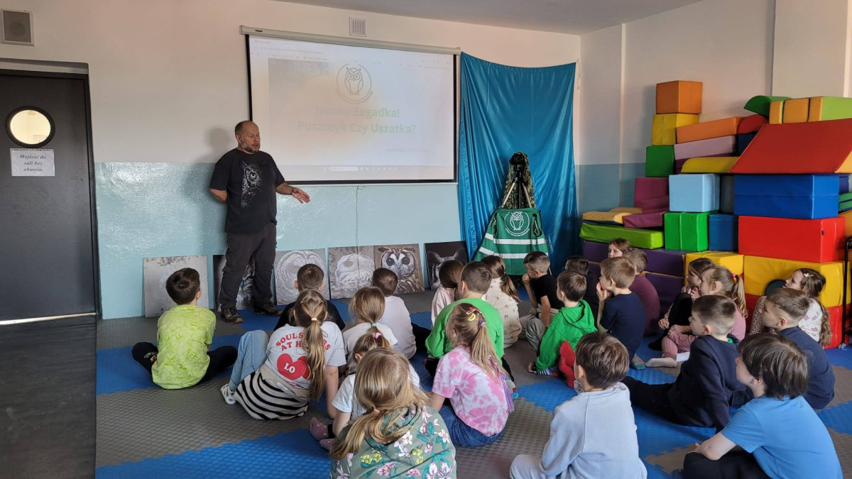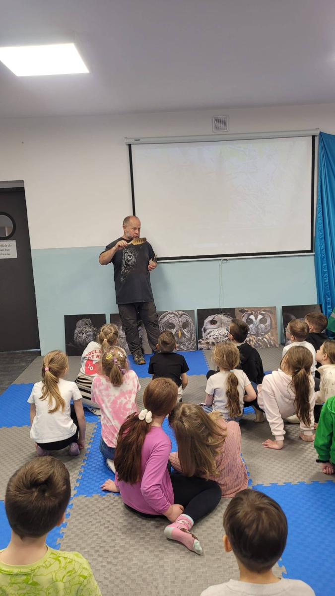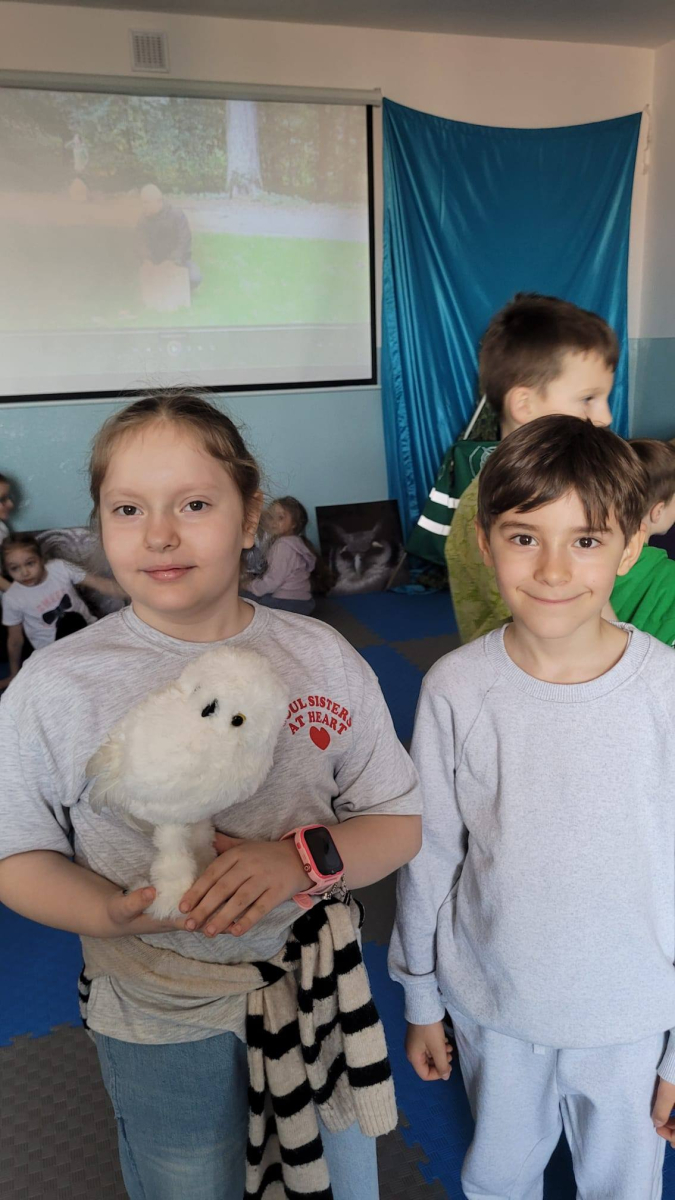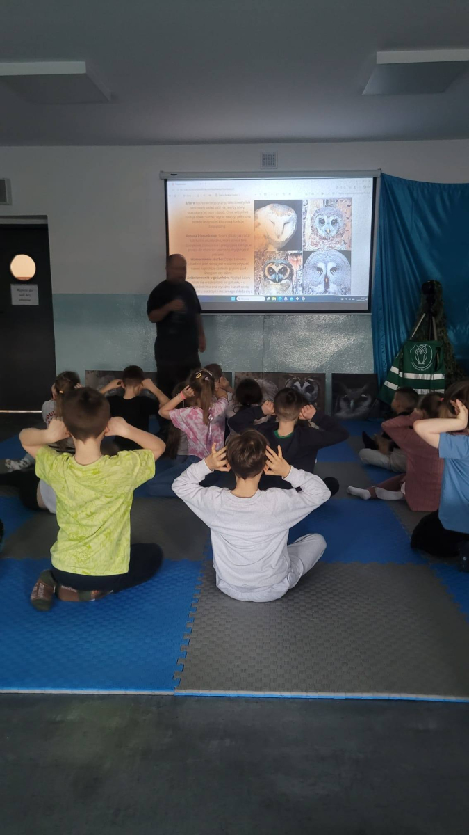 Tym razem dzieci odkrywały fascynujący świat sów – ich zwyczaje, różnorodność oraz tajemnice nocnego życia. Była to nie tylko dawka ciekawostek, ale też wyjątkowe doświadczenie – uczniowie mogli dotknąć prawdziwego pióra sowy, posłuchać jej odgłosów oraz obejrzeć interesujące materiały filmowe.