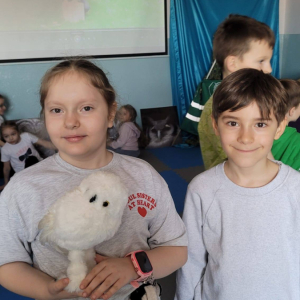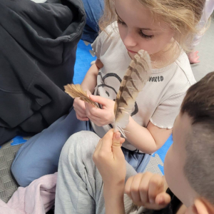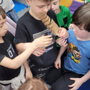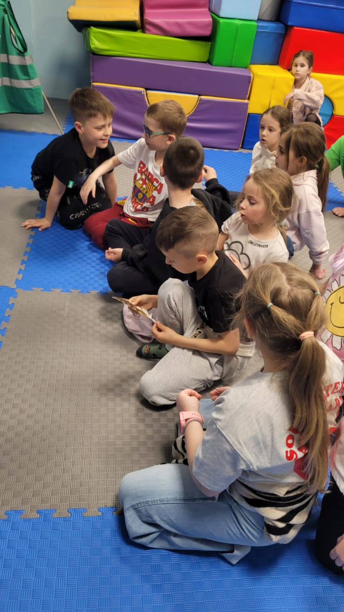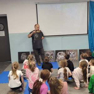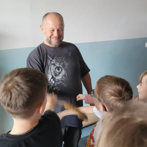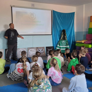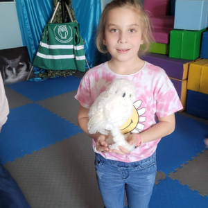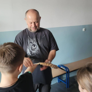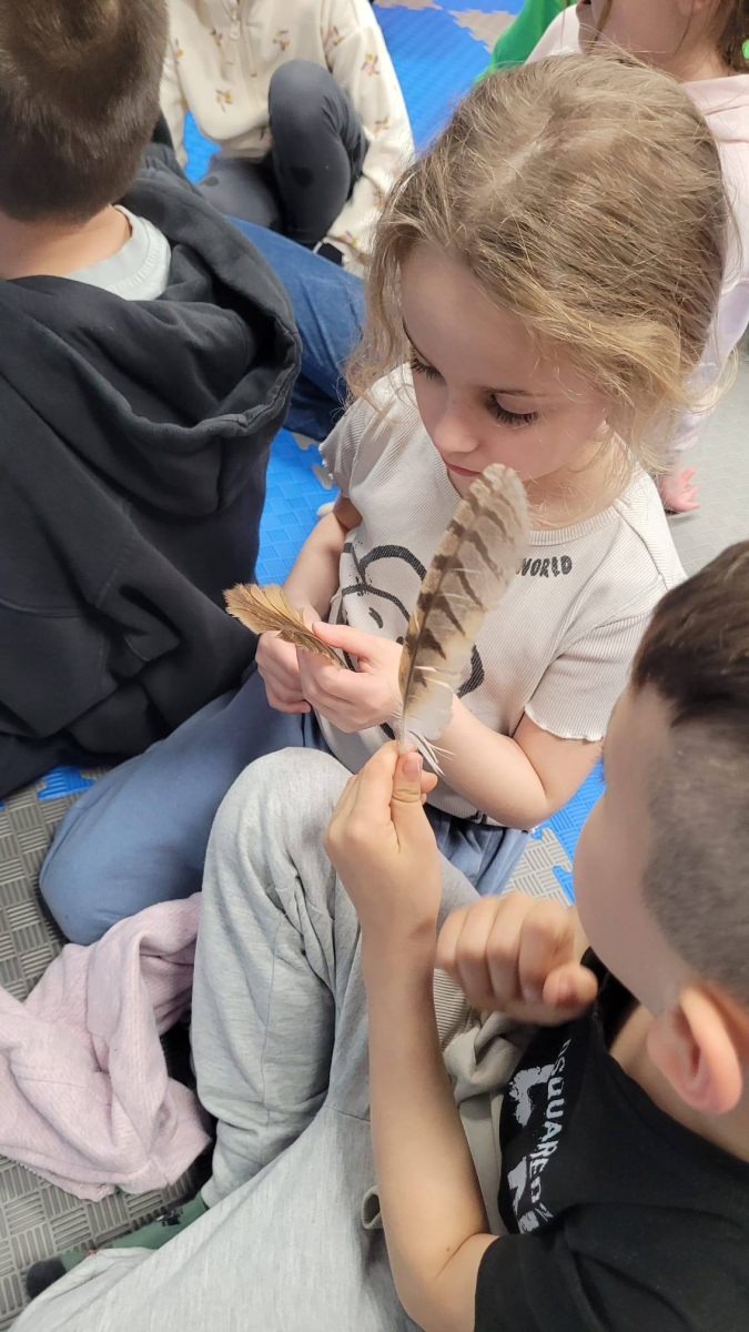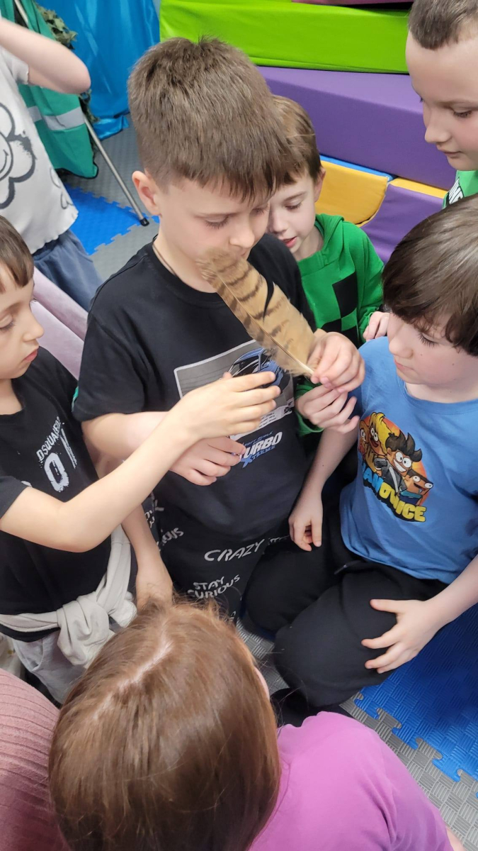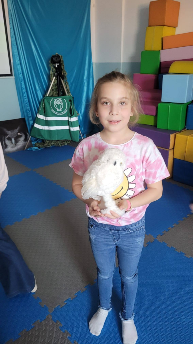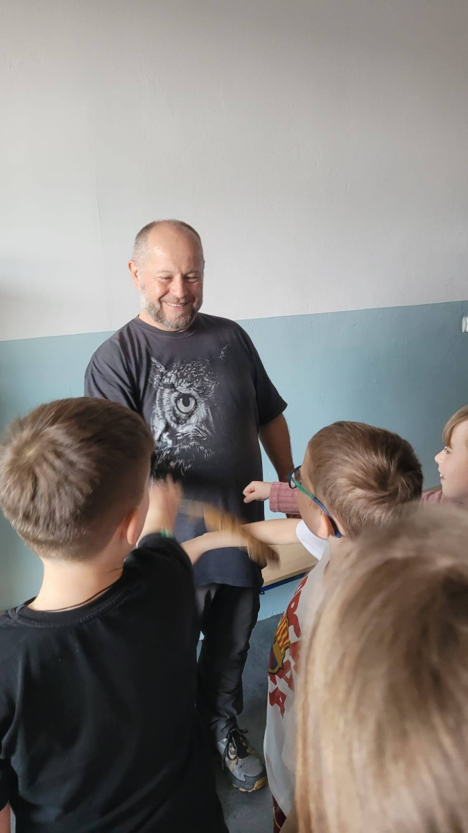 Tym razem dzieci odkrywały fascynujący świat sów – ich zwyczaje, różnorodność oraz tajemnice nocnego życia. Była to nie tylko dawka ciekawostek, ale też wyjątkowe doświadczenie – uczniowie mogli dotknąć prawdziwego pióra sowy, posłuchać jej odgłosów oraz obejrzeć interesujące materiały filmowe.