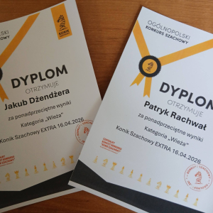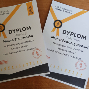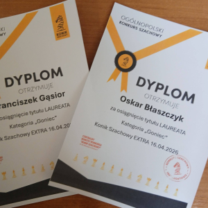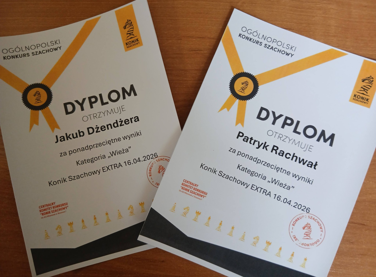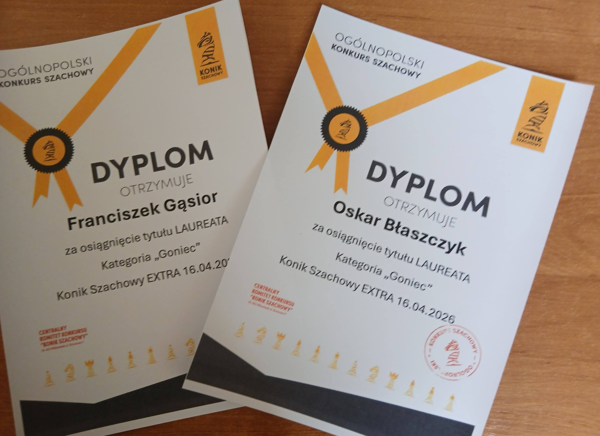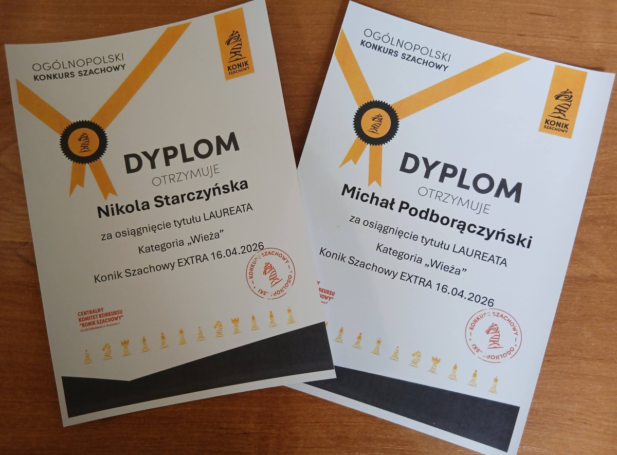 Miło nam przekazać wiadomość, że w Ogólnopolskim Konkursie Szachowym "Konik Szachowy", który polegał na rozwiązywaniu przesłanych zadań i zagadek szachowych, z sześciu uczniów, którzy przystąpili w naszej szkole do tego konkursu, czterech z nich wywalczyło tytuł laureata w swoich kategoriach.