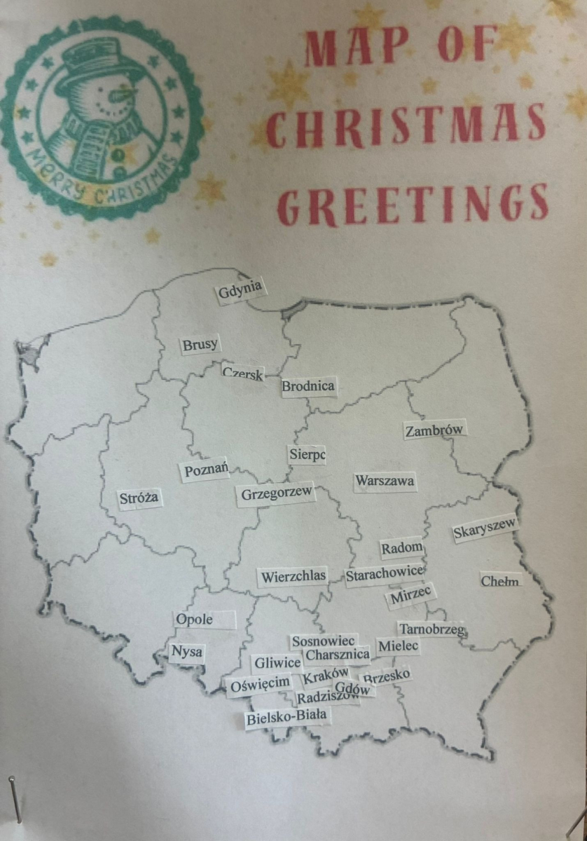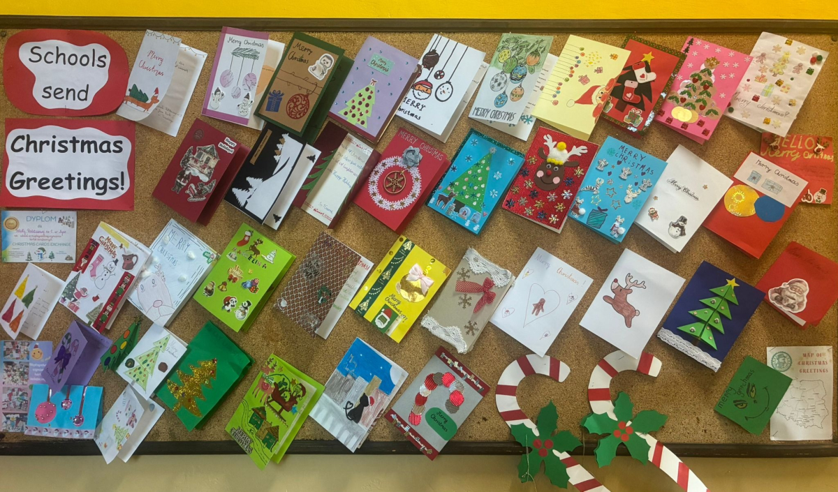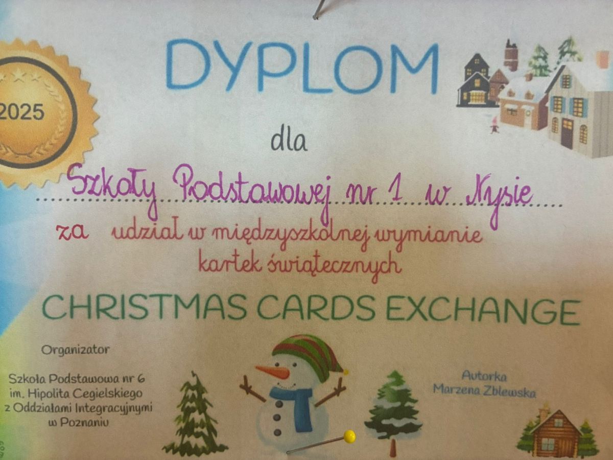 Edukacja językowa tym razem przybrała wymiar wykraczający poza szkolne mury. W ramach Ogólnopolskiego Projektu Christmas Cards Exchange (ang. Wymiana kartek świątecznych) powstały zimowe życzenia w j. angielskim, które tradycyjną drogą pocztową trafiły do 47 placówek na terenie całej Polski. W odpowiedzi na nie do naszej szkoły zawitał listonosz z workiem radosnych przesyłek. Z dumą prezentujemy także otrzymany dyplom potwierdzający uczestnictwo w akcji