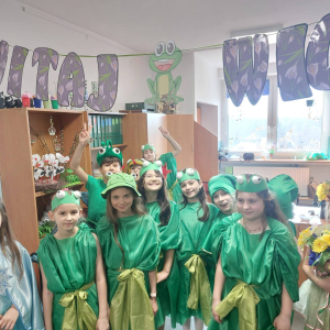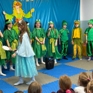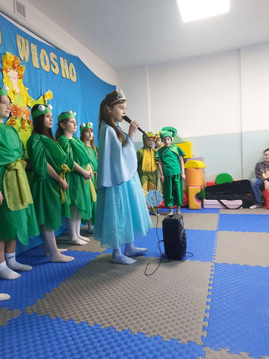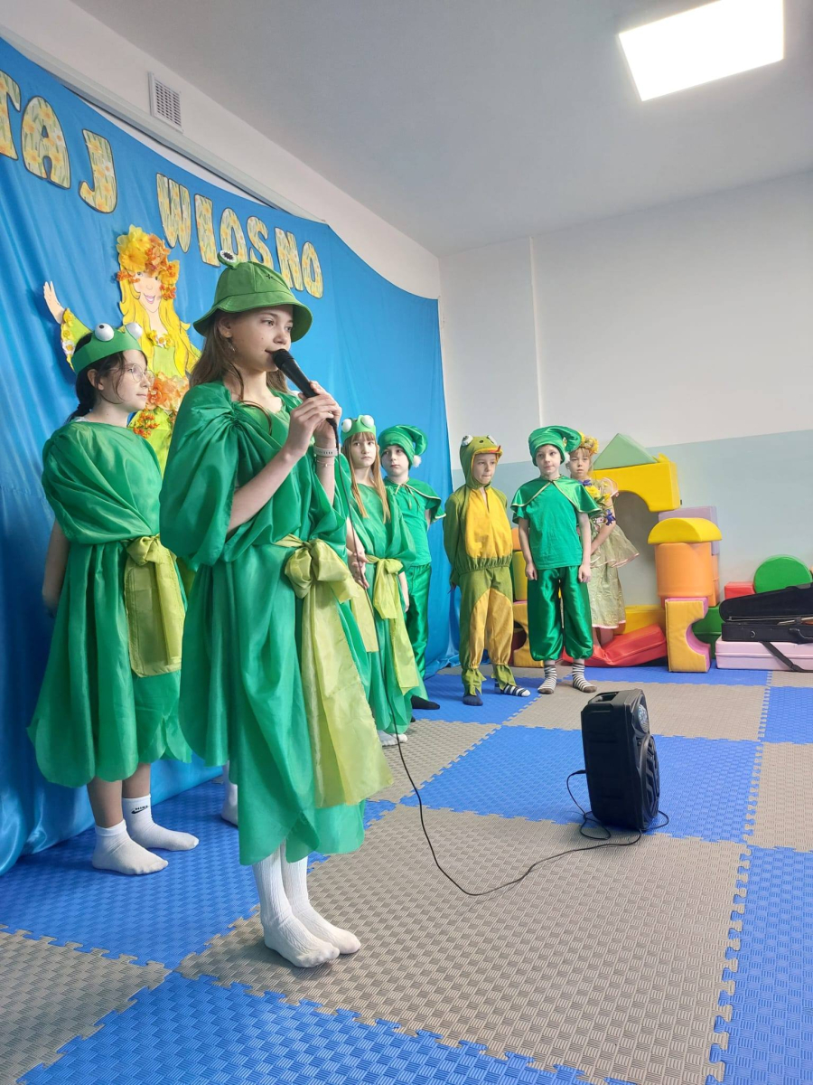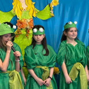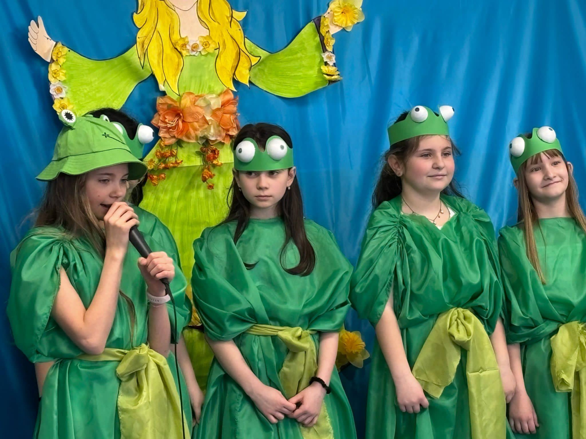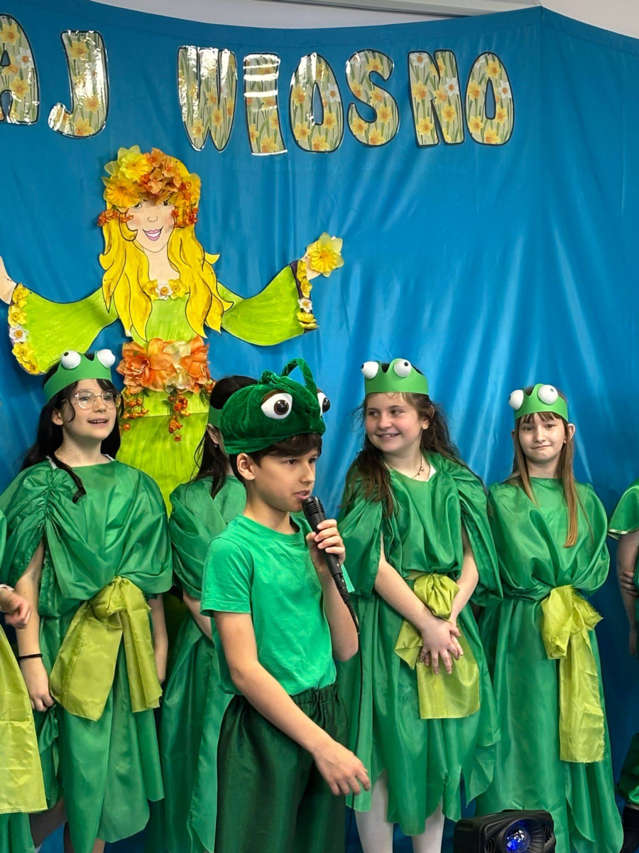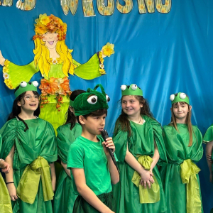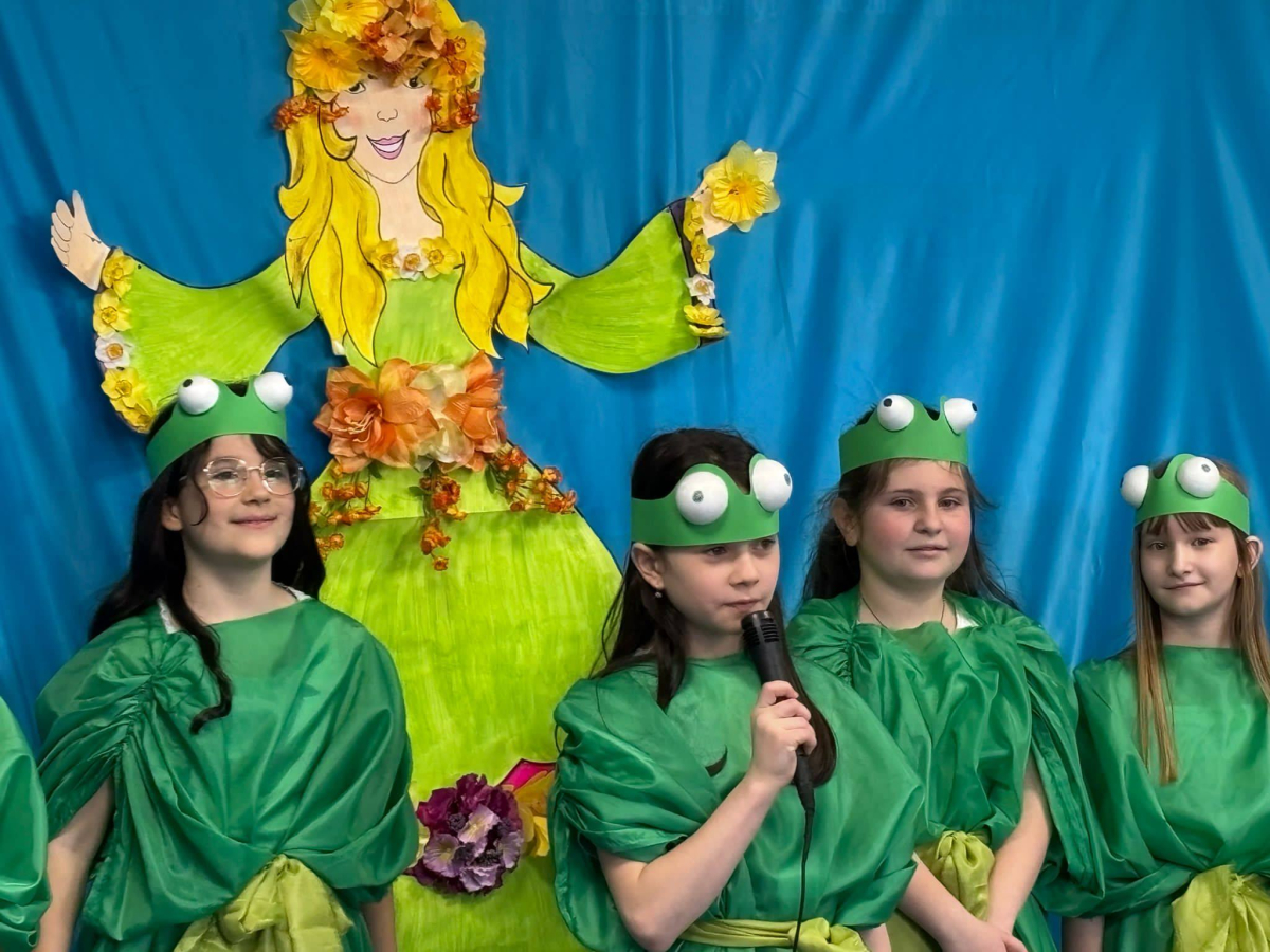 Scena wypełniła się zielenią, kwiatami i uśmiechem. Szczególną sympatię wzbudziły urocze „żabki”, które swoim występem dodały całości lekkości i humoru. Nasi artyści zachwycili pięknymi strojami oraz zaangażowaniem, a wspólnie wykonana piosenka jeszcze bardziej podkreśliła radosny charakter przedstawienia.
