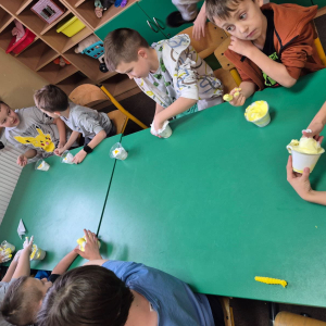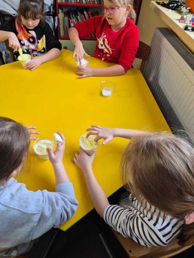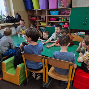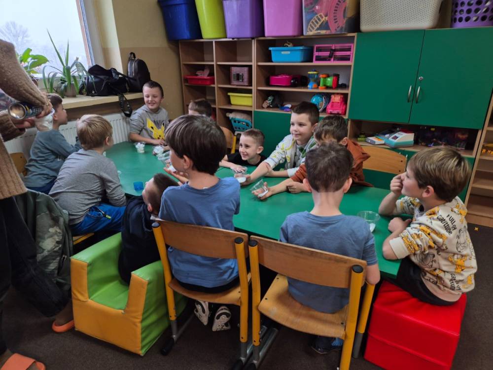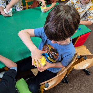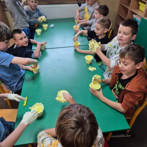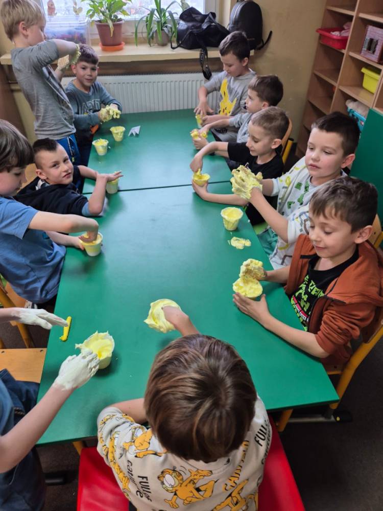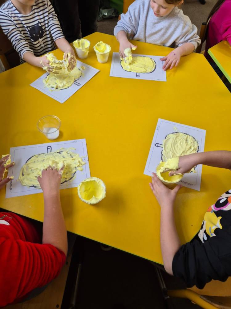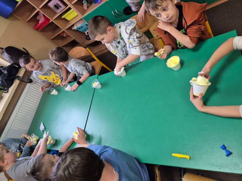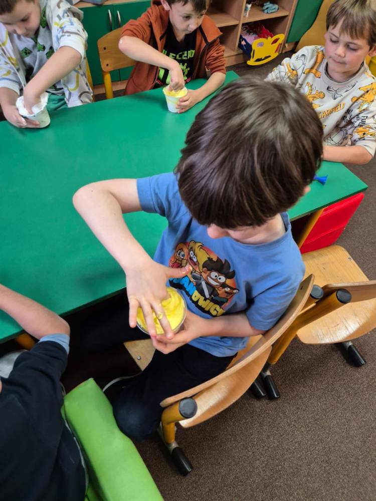 Zajęcia odbyły się w ramach innowacji „Dotknij, poczuj, stwórz – twórcze zabawy sensoplastyczne”.